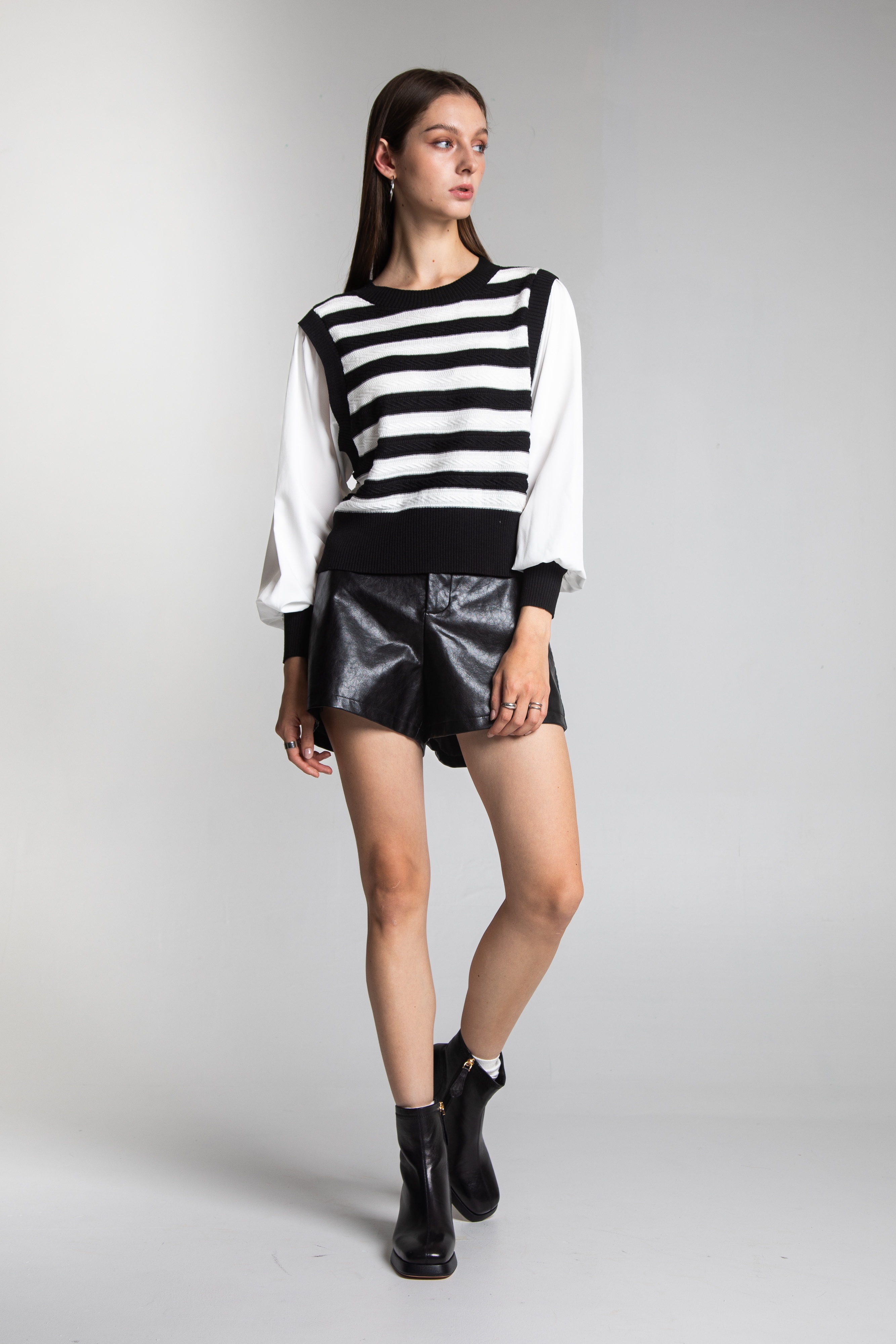 這款上衣是針織背心與襯衫袖子的假兩件式設計,輕鬆打造出多層次穿搭的時髦感。黑白橫條紋針織背心是主要視覺焦點,採用經典的圓領和短版剪裁。