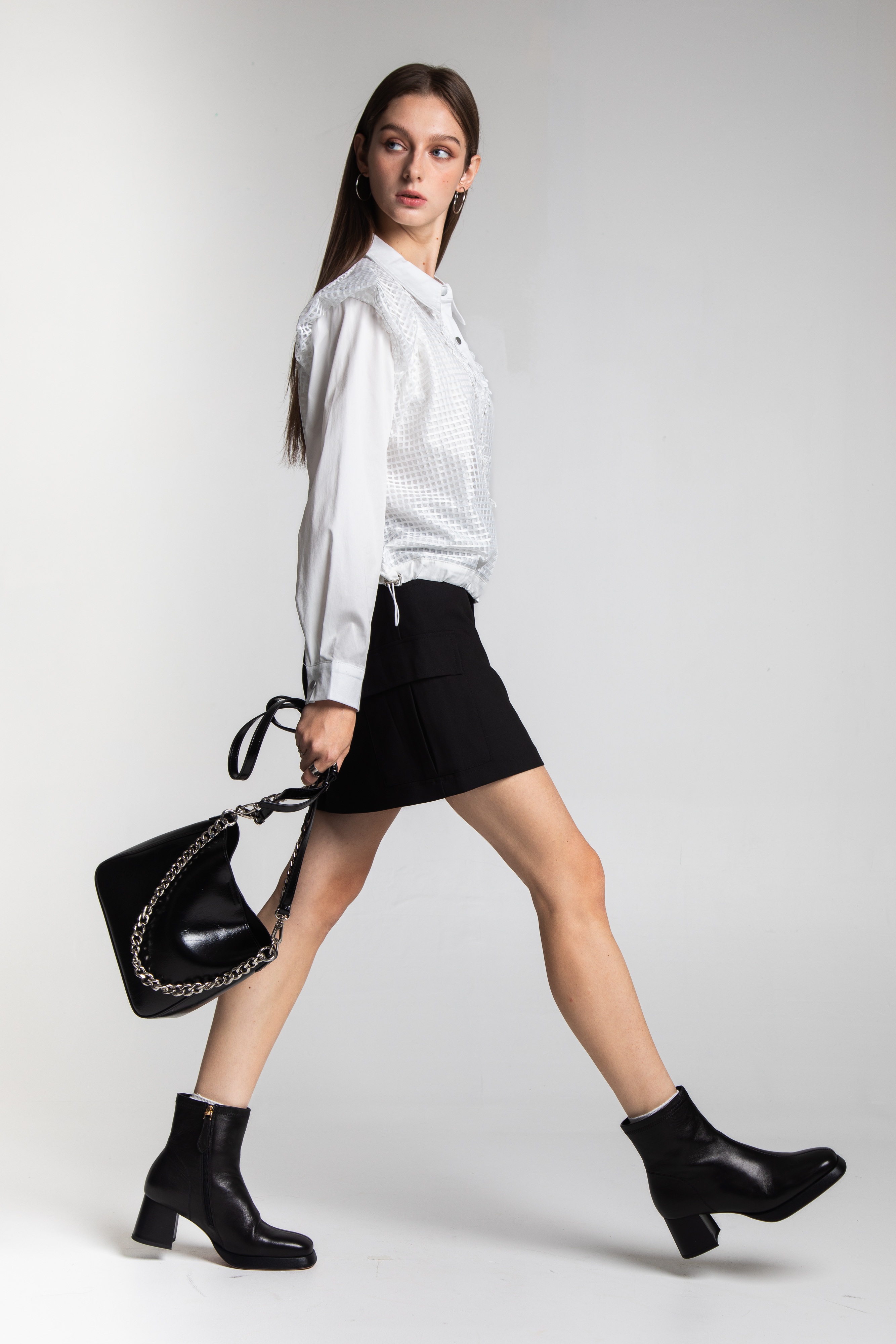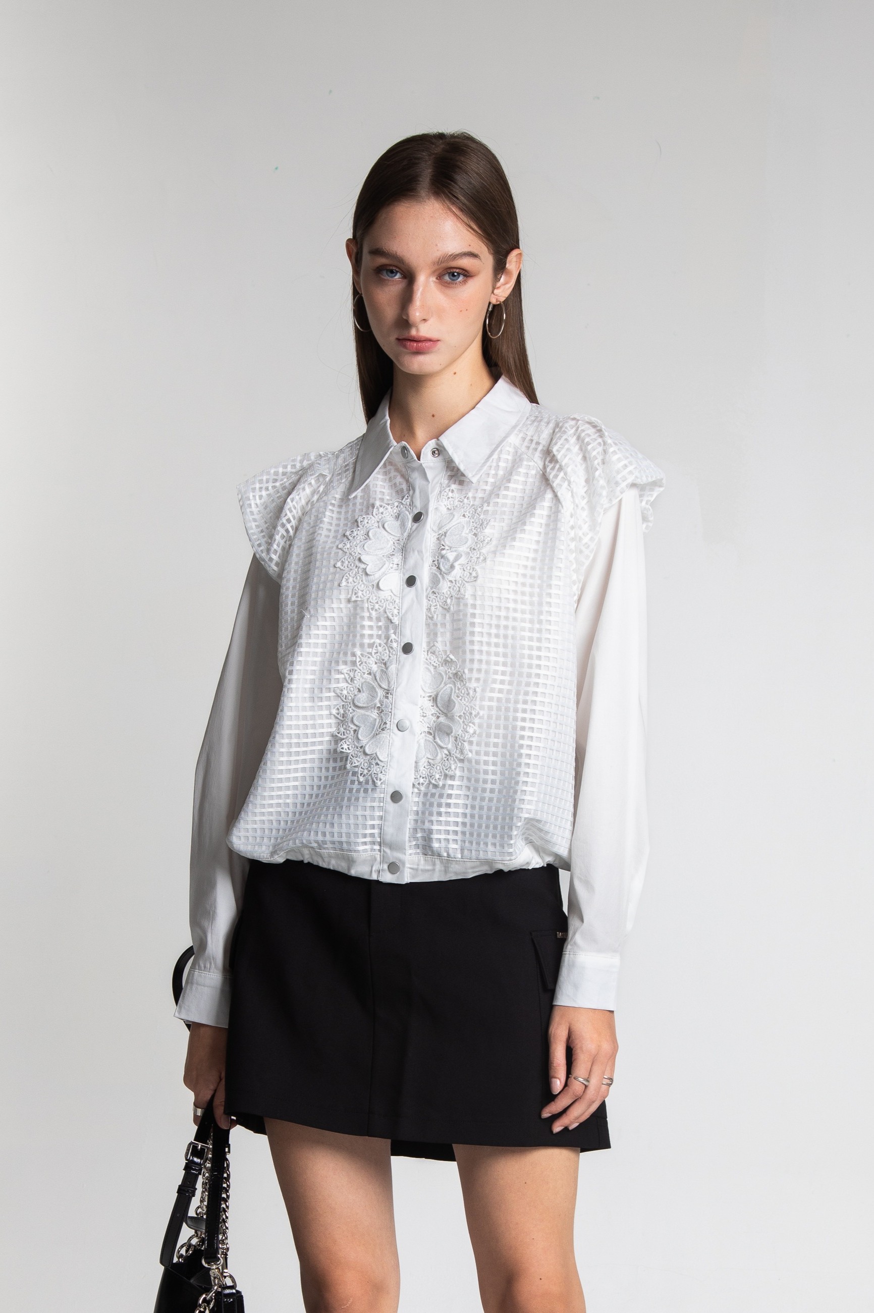這款襯衫以黑白色系為主,巧妙地結合了立體格紋布料與精緻的立體蕾絲花朵,展現出優雅又充滿設計感的風格。肩部的荷葉邊/飛袖設計為俐落的襯衫增添了一抹柔美,而胸前的立體蕾絲點綴則讓整體造型充滿了細節與層次感。