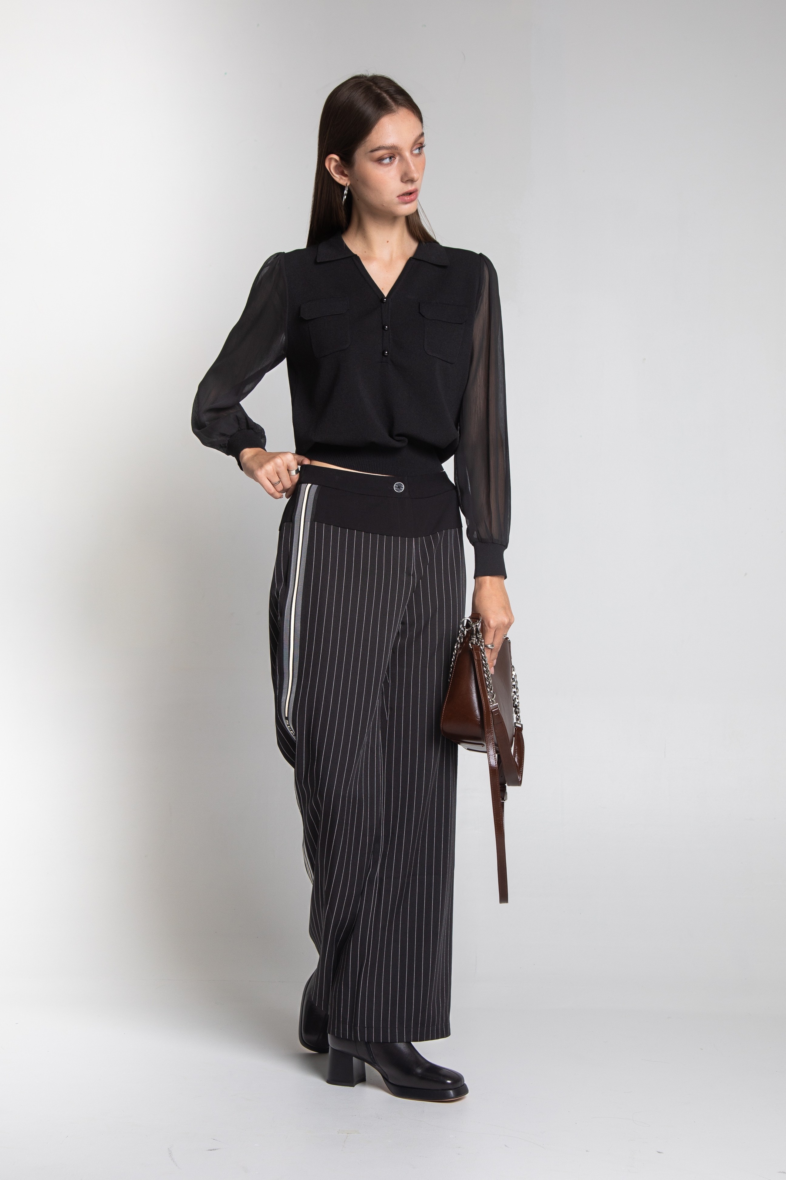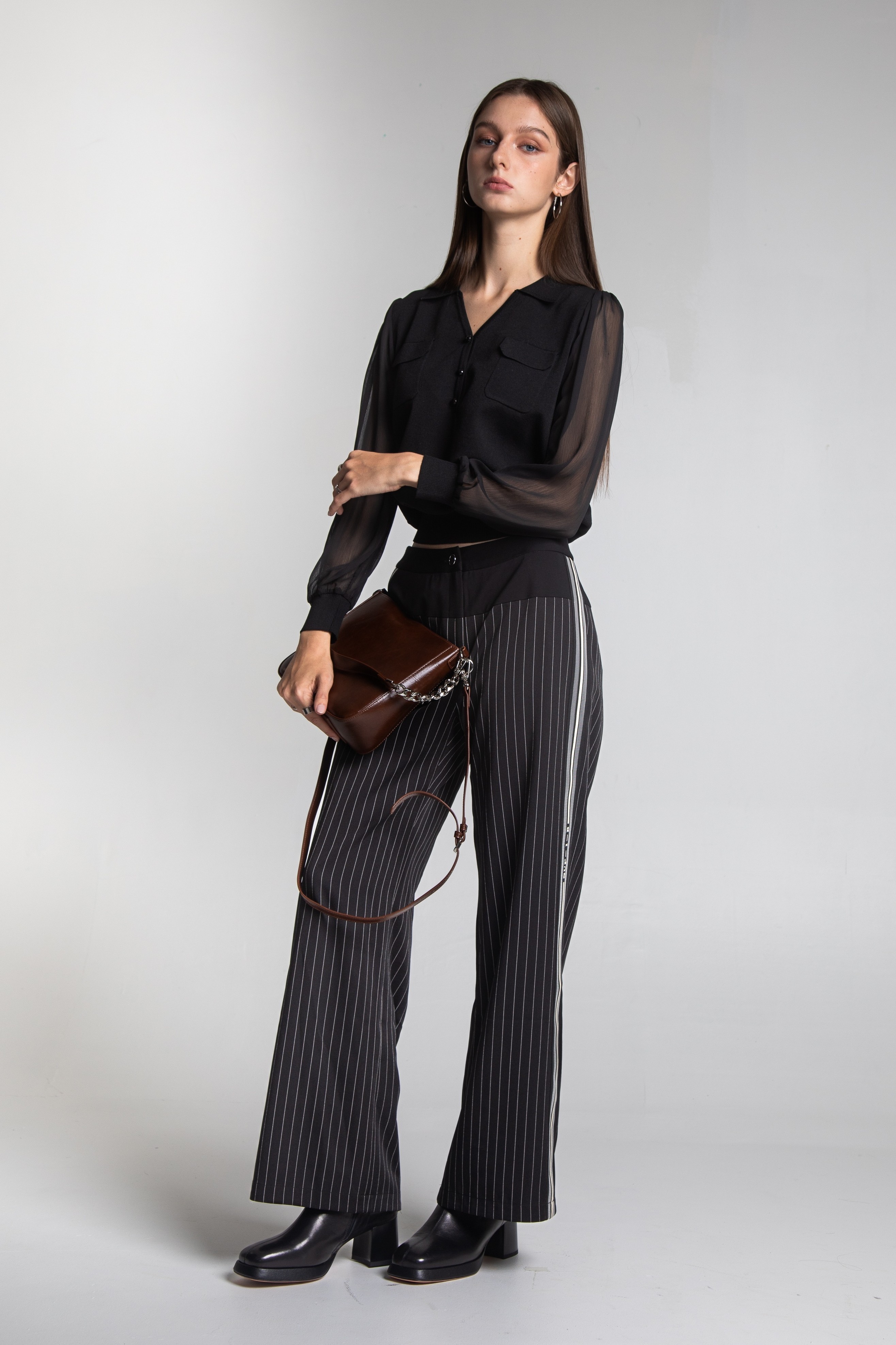 這款長褲以寬鬆的直筒版型設計,剪裁俐落且修飾腿型。經典的黑白細直條紋圖案,營造出視覺的延伸感。褲身側邊飾有白色飾帶,為整體造型增添了一抹率性的運動風格。
