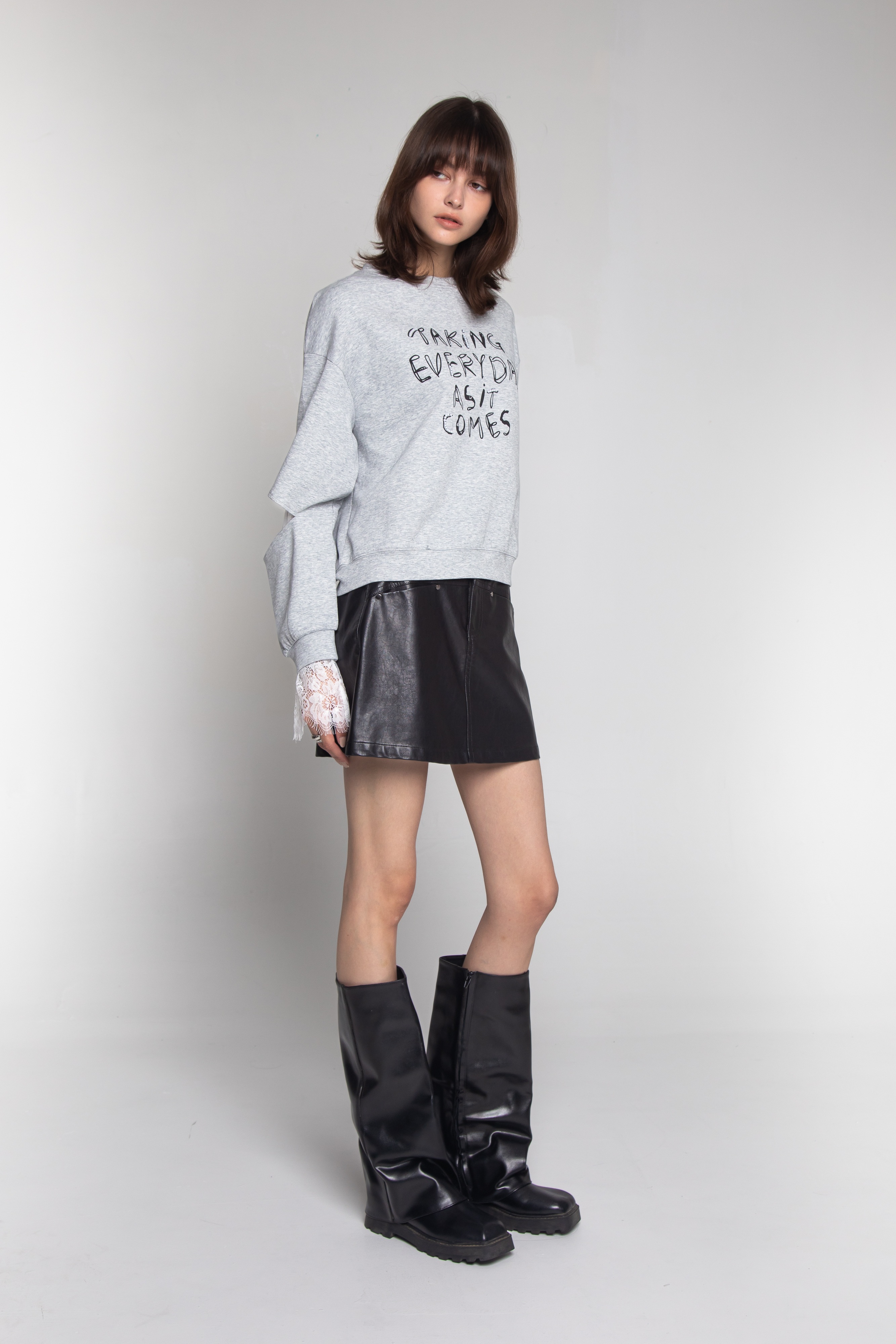 這款蕾絲袖上衣,以其沉穩的麻灰主色調,展現出低調而隨性的氣質。寬鬆的落肩剪裁和略短的衣身設計,能巧妙地修飾身形比例,視覺上更顯俐落。