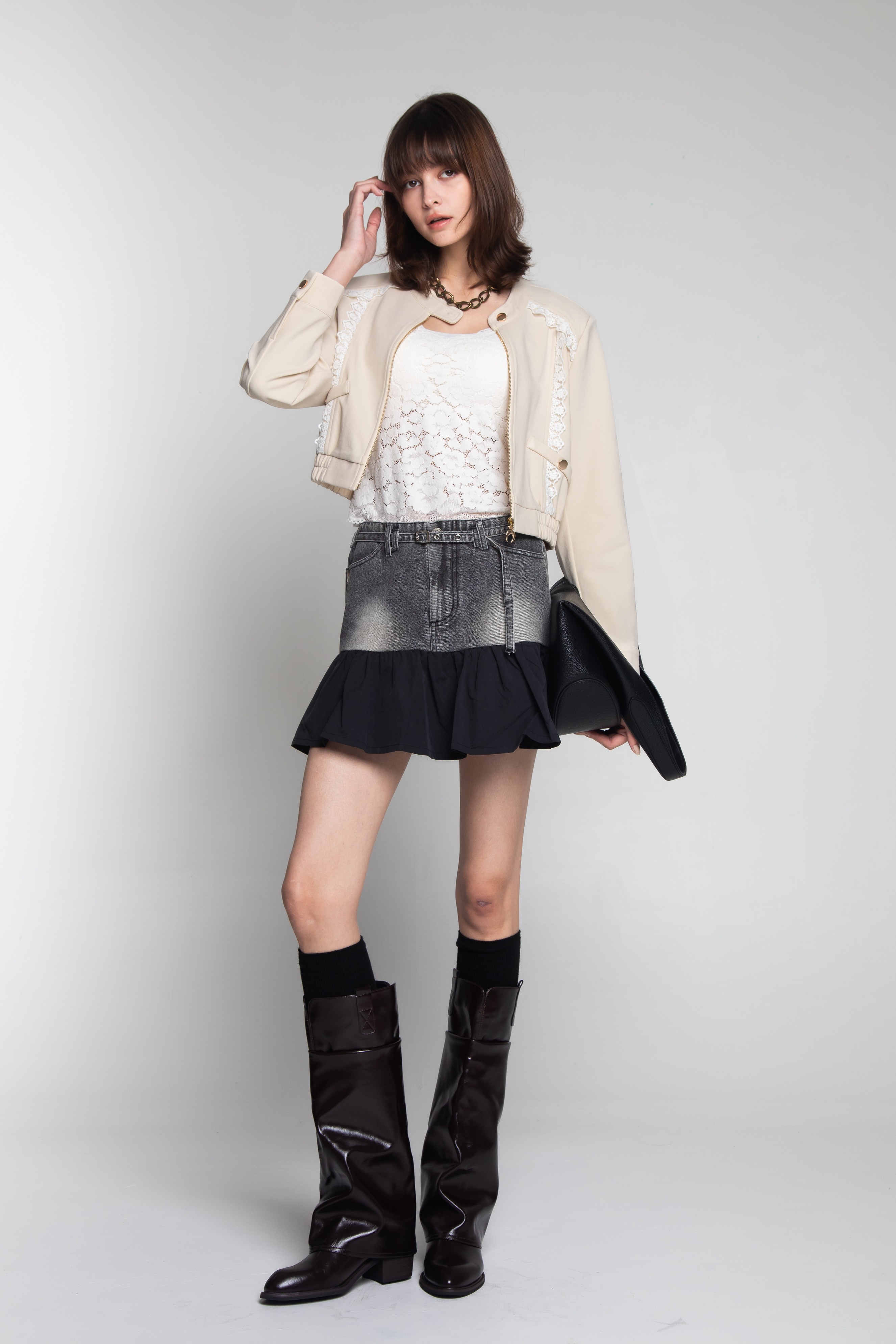這款牛仔剪接短裙,以其獨特的兩段式設計,展現出甜美與街頭感並存的個性氣質。裙身採用沉穩的深灰漸層牛仔布,從腰間至臀部呈現出自然的刷色效果,為整體帶來復古而率性的視覺層次。