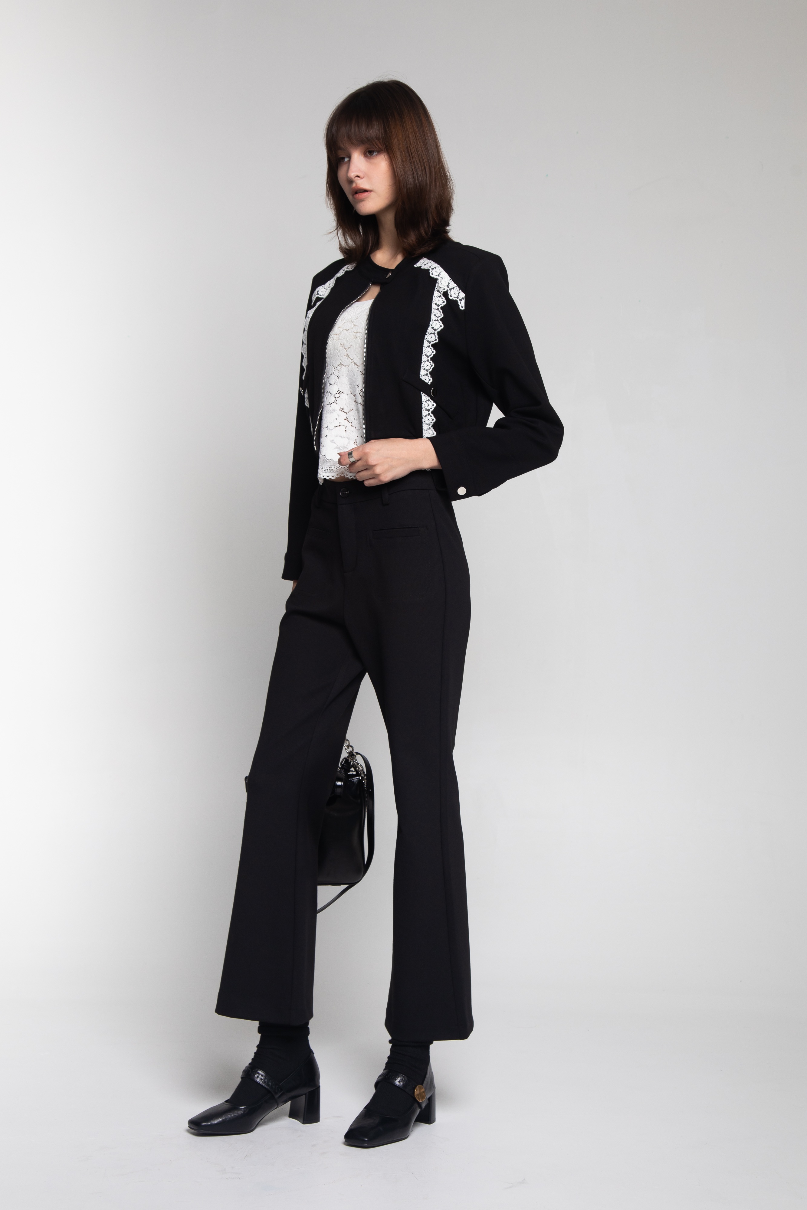 這款微喇叭褲,以其沉穩的經典黑色調,展現出低調而專業的優雅氣質。中高腰的合身剪裁能平整地修飾腰腹線條,搭配筆直的褲管設計,帶來極佳的修身效果。