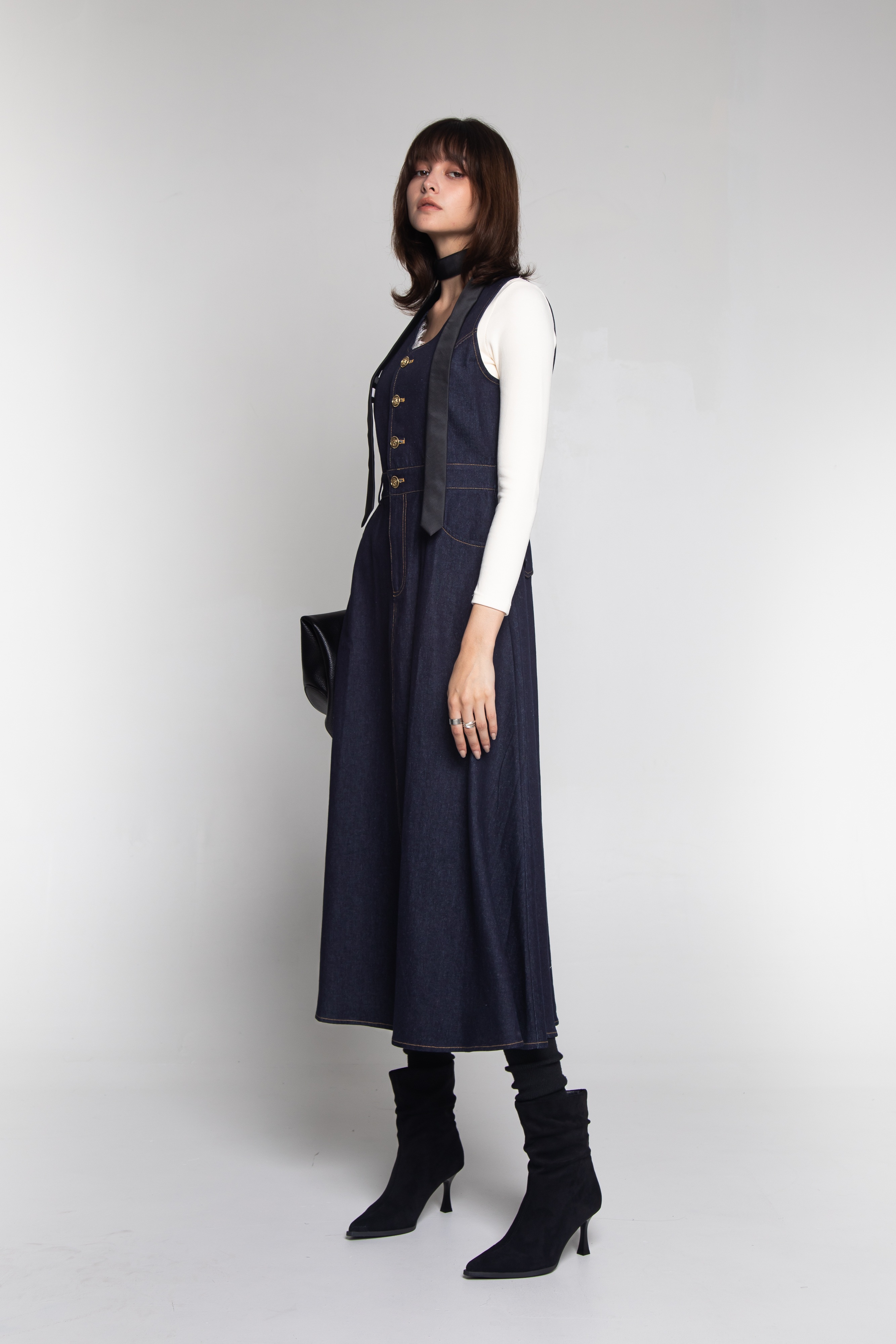 這款牛仔背心式洋裝,以其沉穩的深靛藍色調,展現出低調而內斂的復古優雅氣質。洋裝採用了修身的背心剪裁,搭配高腰線設計,能完美勾勒出上半身的線條,並將視覺焦點向上集中。
