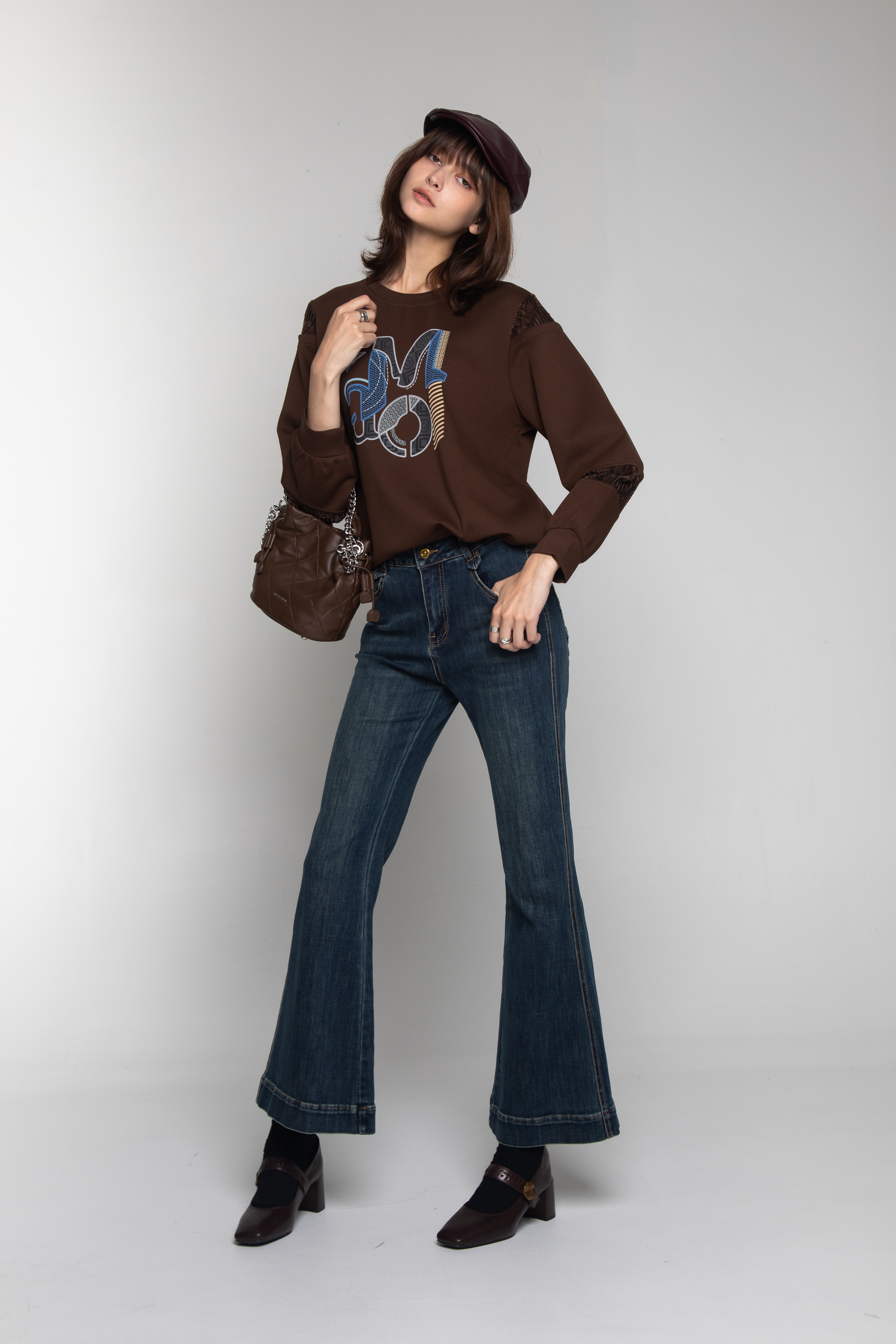 這款微喇牛仔長褲,以其沉穩的中深藍色水洗調,展現出經典而富有復古感的率性氣質。褲型採用了貼身的高腰剪裁,能平整地收束腰腹,從臀部至膝蓋處的合身設計,帶來極佳的修飾和提臀效果。