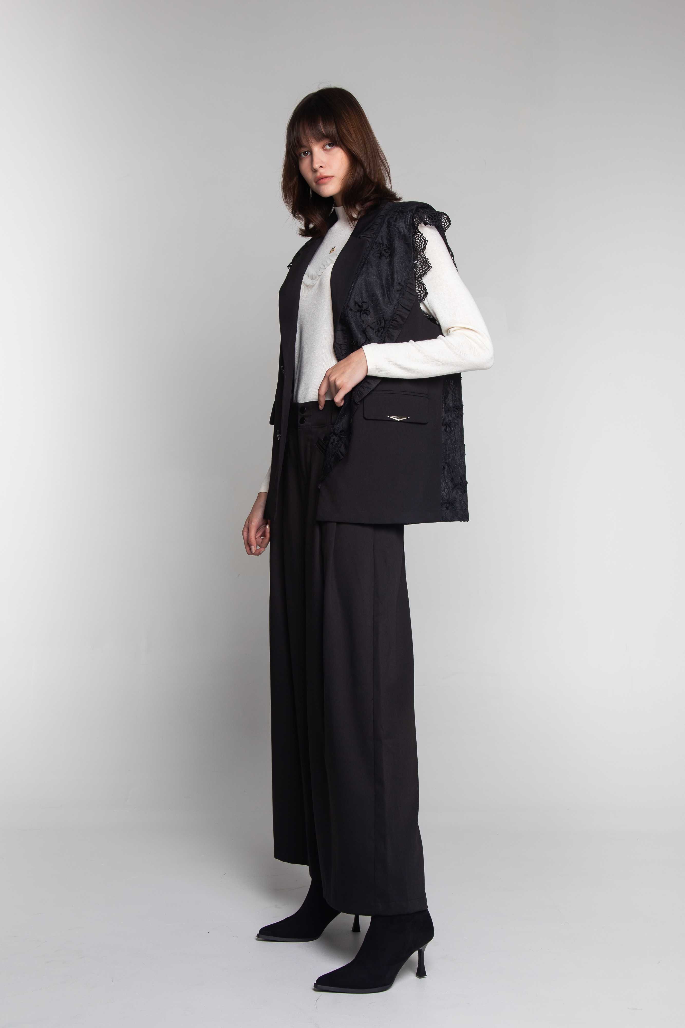 這款時尚造型背心,以沉穩的經典黑色調,展現出俐落且充滿結構感的個性氣質。背心採用了西裝式的修身長版剪裁,搭配標準的西裝領設計和單排鈕釦,營造出幹練的正式感。