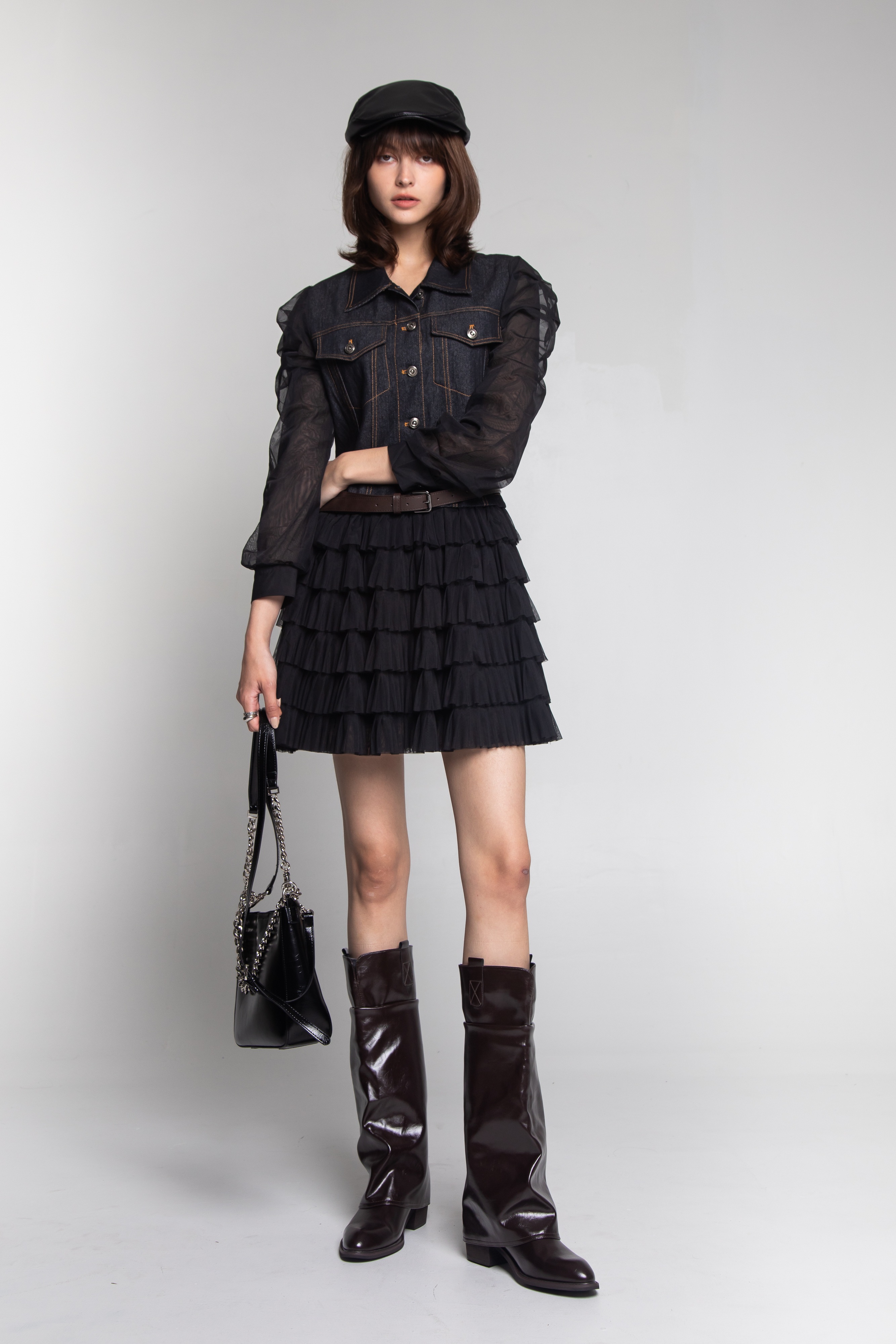 這款拼接牛仔洋裝,以沉穩的深靛藍色丹寧面料為基底,展現出經典而富有復古感的氣質。洋裝採用了背心式的修身剪裁,搭配高腰線和A字長裙襬,能完美勾