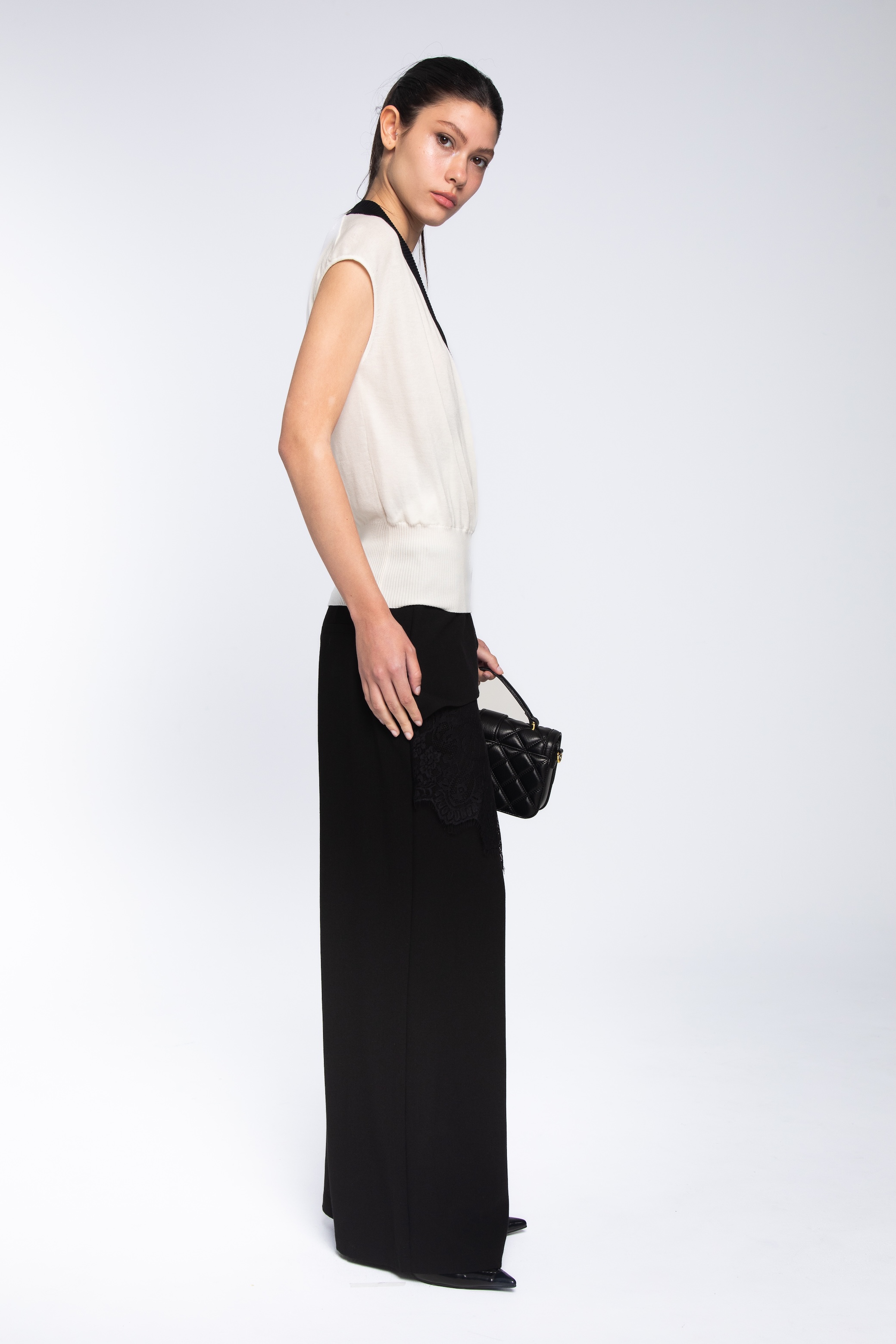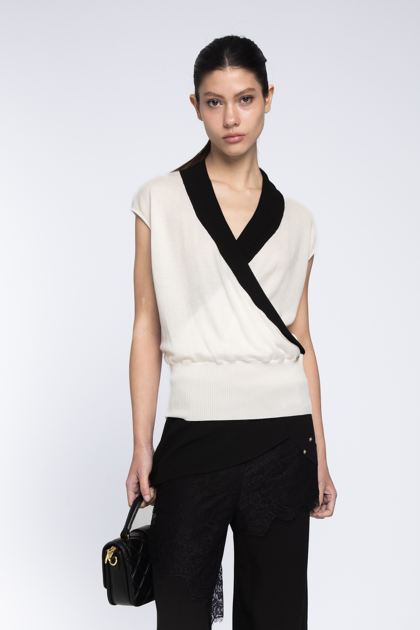 這款無袖針織上衣,以純淨的米白色為基底,巧妙融入了極具視覺張力的黑色撞色細節。設透過俐落的幾何線條與充滿女人味的交疊剪裁,為日常穿搭注入一股無懈可擊的知性與優雅。