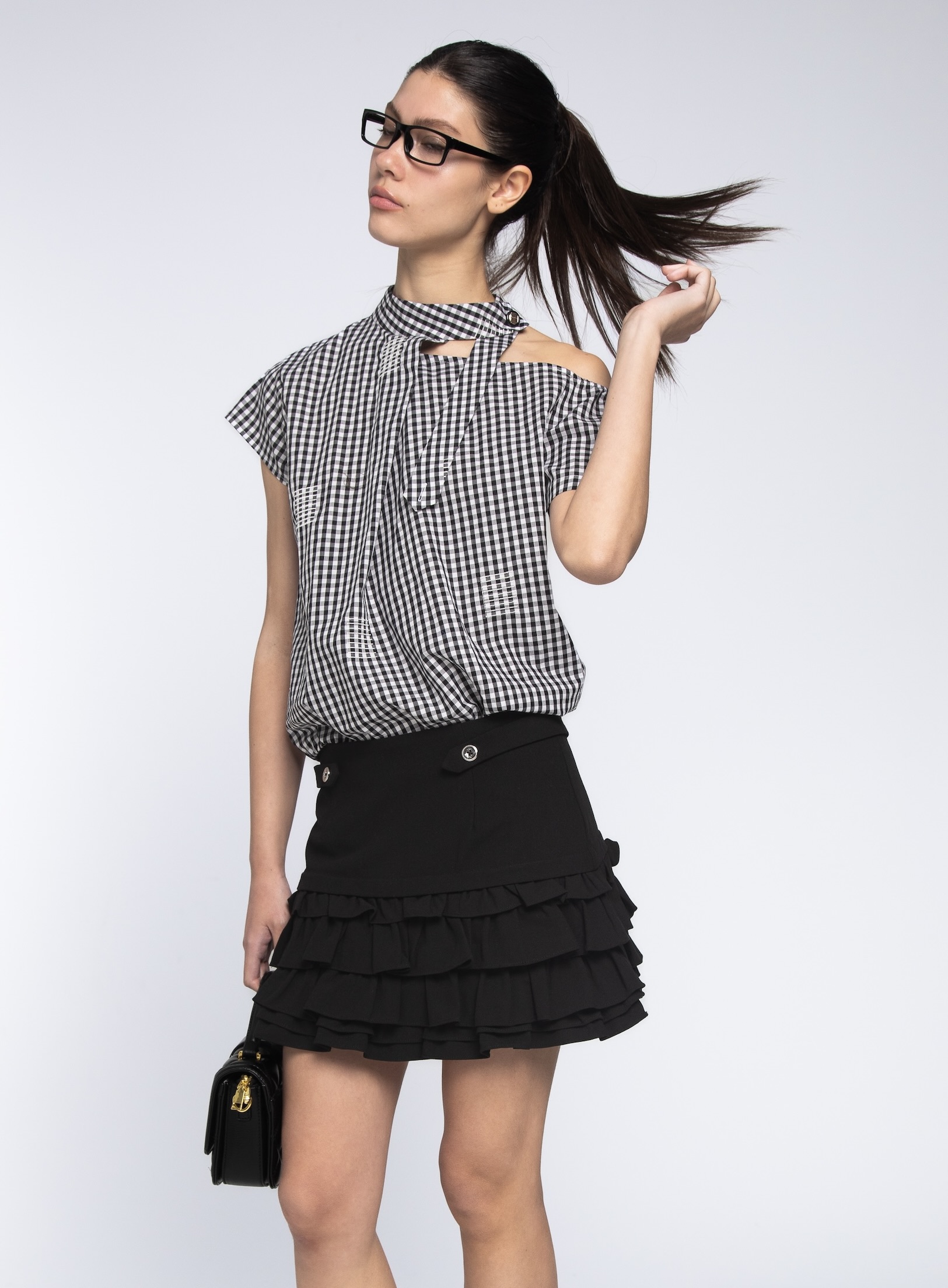 這款時尚格紋上衣,以歷久彌新的黑白維希格紋為基調。透過大膽的不對稱剪裁與心機露膚設計,讓這件單品在復古知性中,散發出令人耳目一新的現代摩登感。