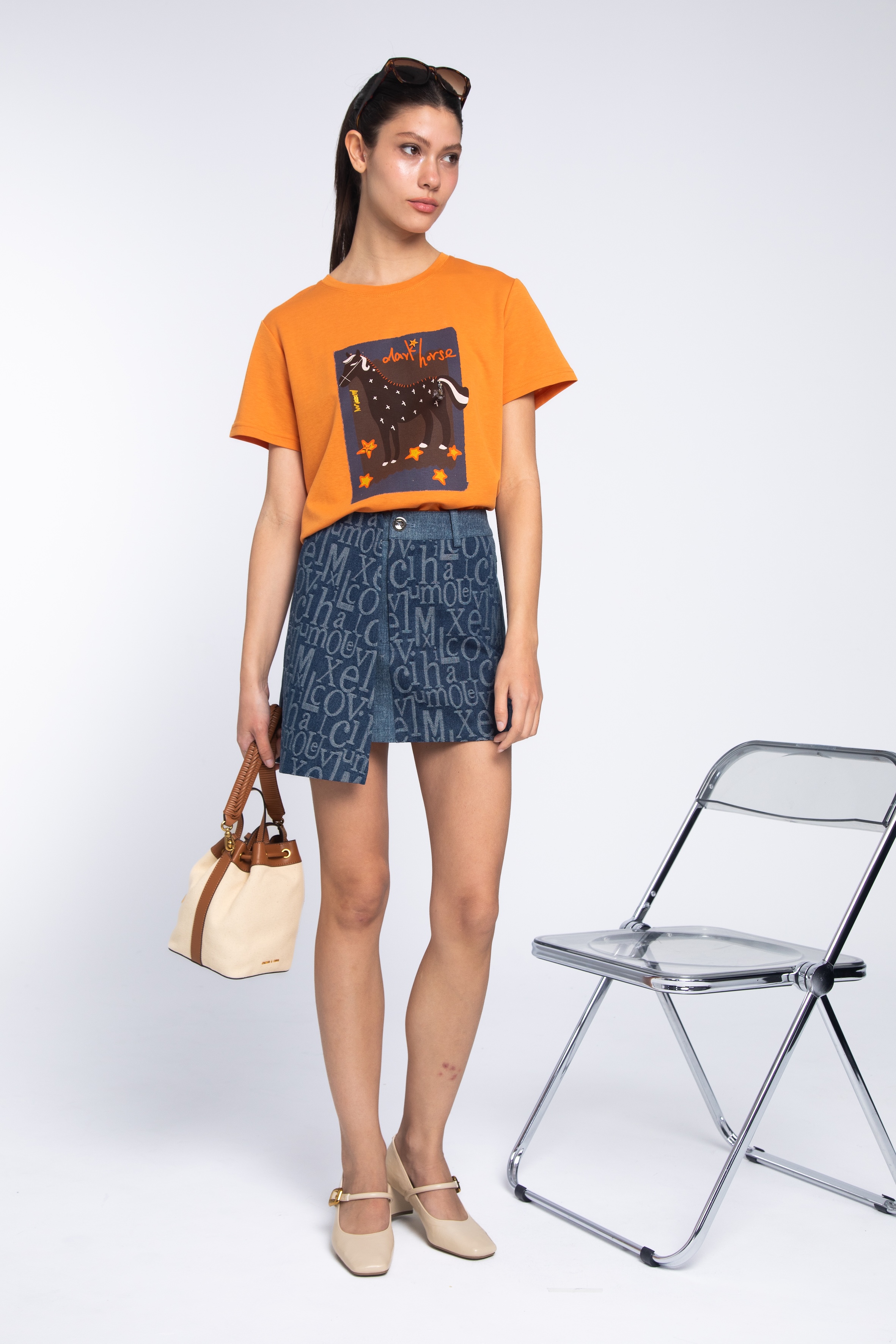 這款休閒印花上衣選用了極度顯白且充滿陽光氣息的活力亮橘色為基底。設計師透過胸前帶有手繪感與復古濾鏡的印花圖騰,讓這件基礎的 T 恤瞬間跳脫平凡,展現出俏皮、率性且充滿活力的美式街頭氛圍。
