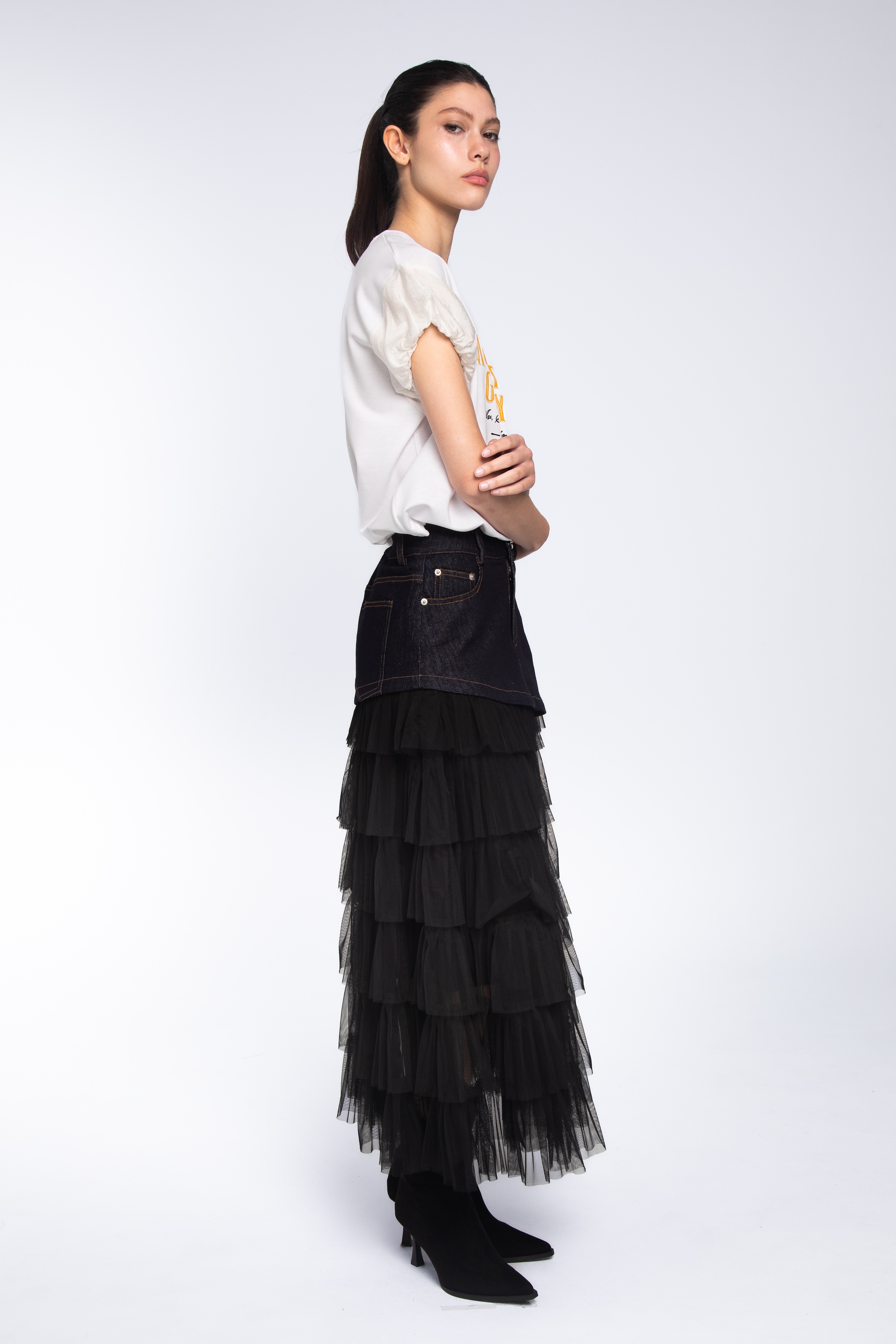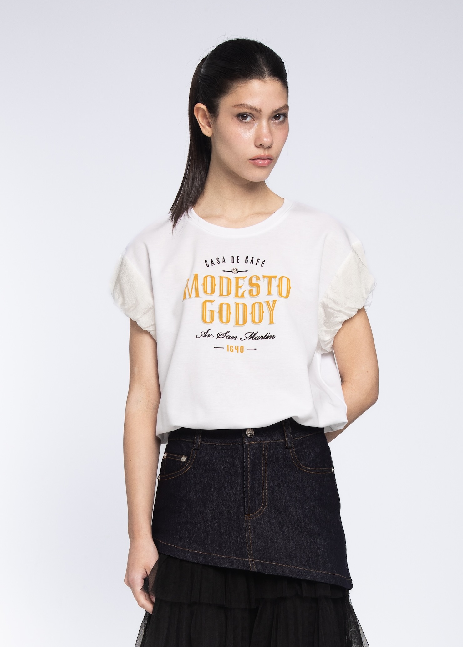 這款文字圓領上衣以純淨且極具包容性的白色為完美畫布。在經典的休閒輪廓中,注入了帶有南歐度假氛圍的復古字體,更出乎意料地在袖口拼接了柔美的網紗細節,讓一件基礎的 T 恤瞬間擁有了高級時裝般的細膩層次。