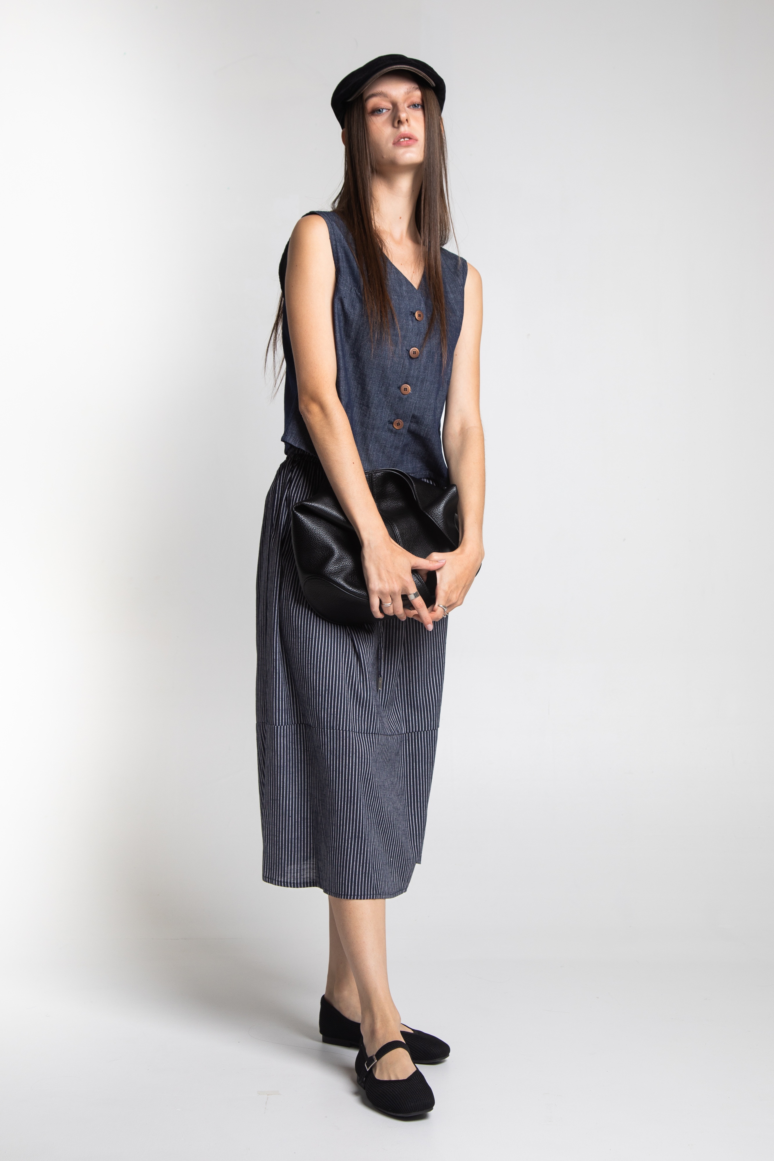 這款牛仔背心長裙,以其俐落的牛仔背心上身和條紋長裙拼接,展現獨特的層次感。背心的排釦設計和長裙的飄逸剪裁,讓你在休閒中也能充滿知性。搭配報童帽,輕鬆打造優雅復古風格。