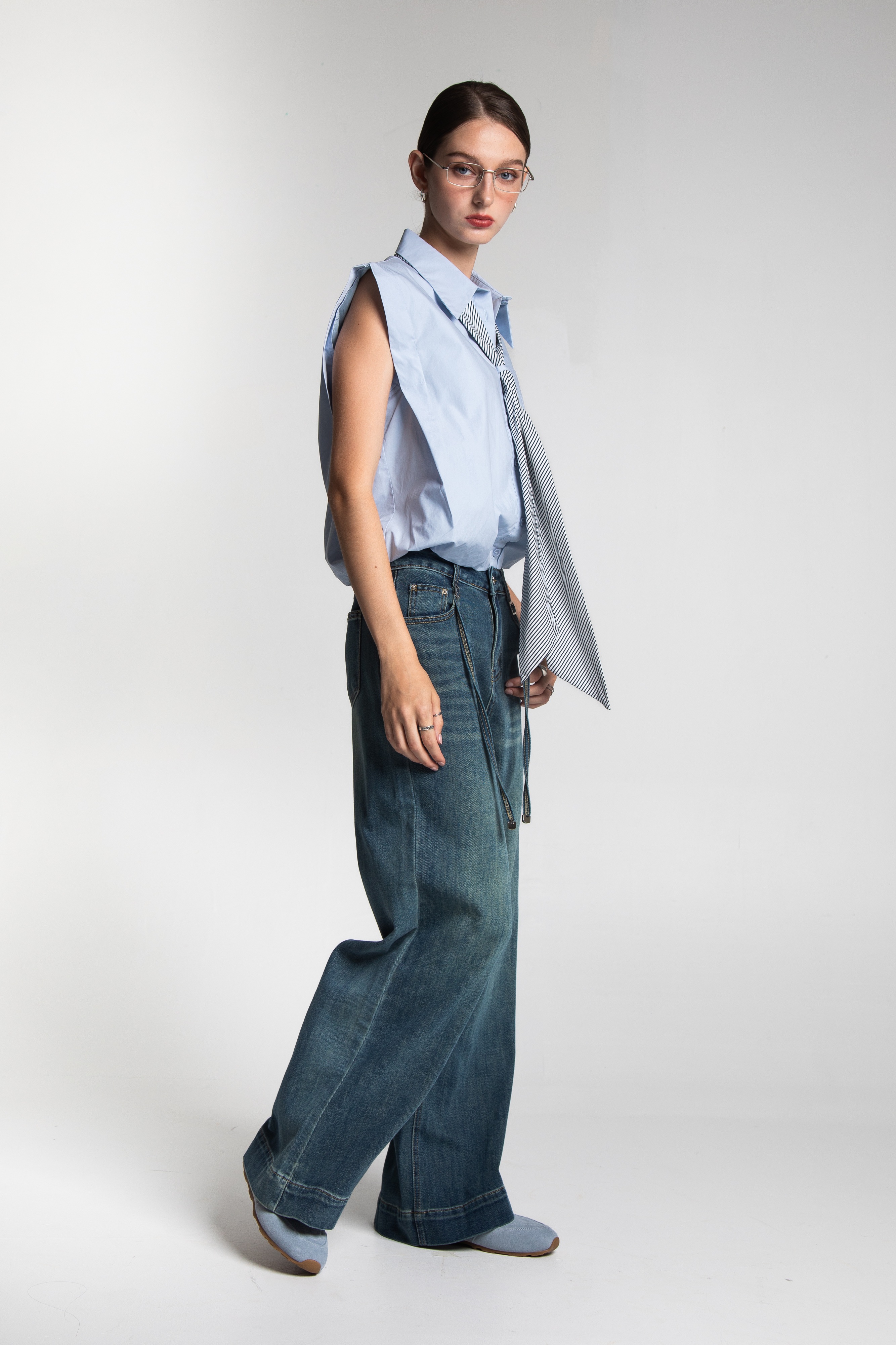 這款雙繩牛仔寬褲,以其復古的淺藍色水洗丹寧布料,營造出隨性又率真的風格。直筒寬鬆的褲管剪裁,不僅能巧妙修飾腿型,更提供極佳的舒適度。