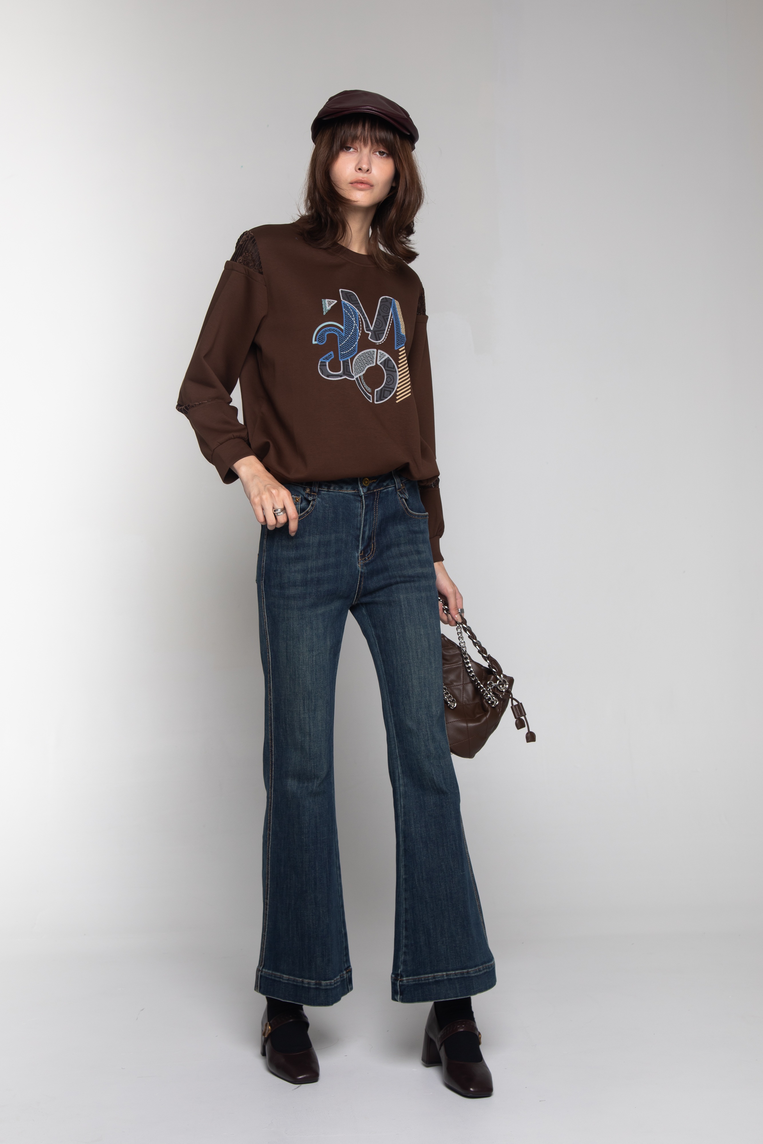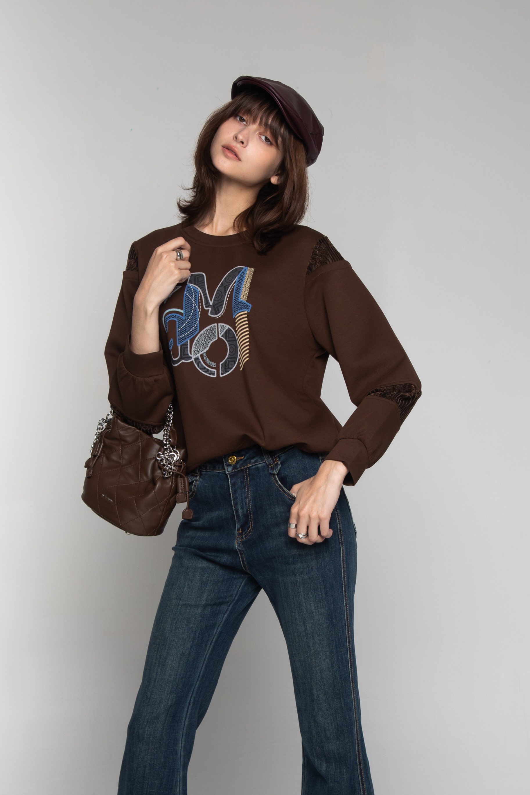 這款印花拼接上衣,以溫暖飽滿的可可棕色調為基底,展現出濃郁而沉穩的復古氣質。寬鬆的衛衣版型設計,穿著舒適自在,營造出隨性慵懶的時尚氛圍。