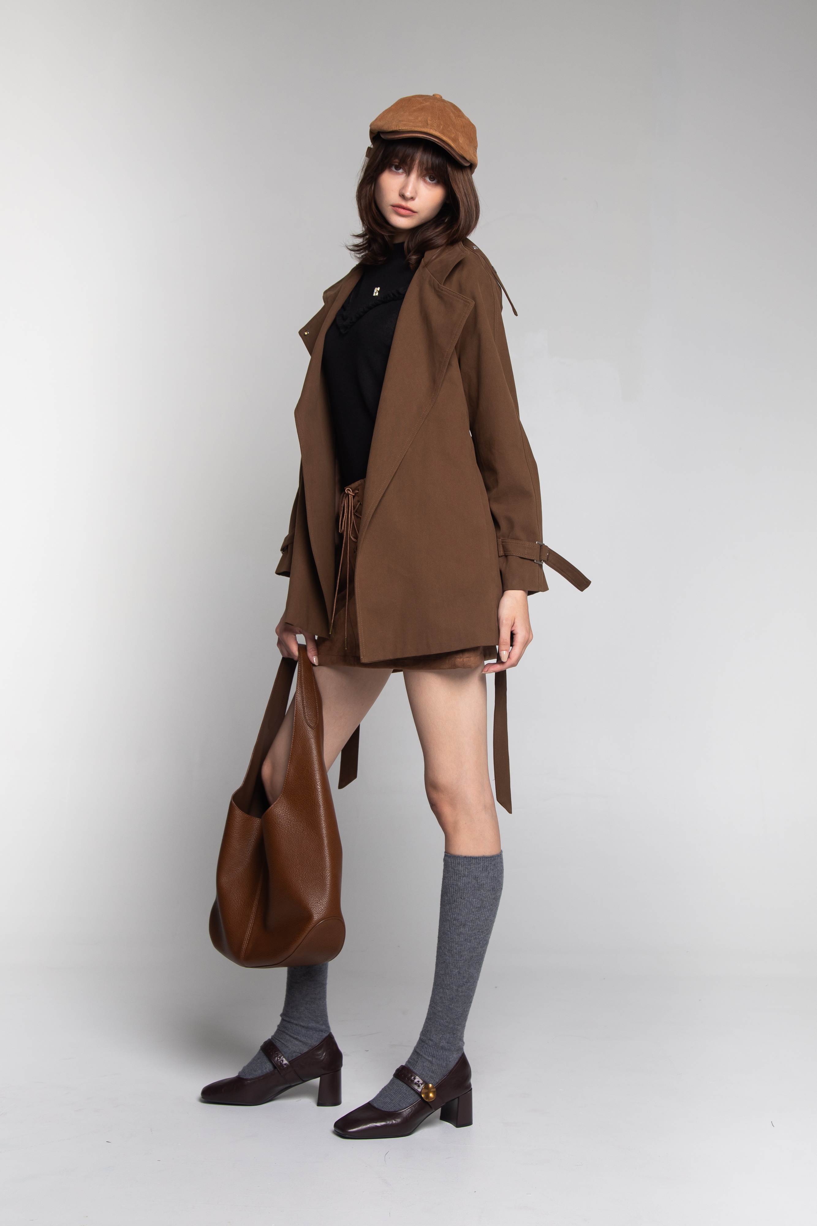 這款時尚俐落風衣,以溫暖飽滿的焦糖棕色調為基底,展現出知性且充滿氣場的時尚魅力。外套採用了短版寬鬆的剪裁,長度約至臀部,能在保有經典風衣結構的同時,視覺上拉高腰線。