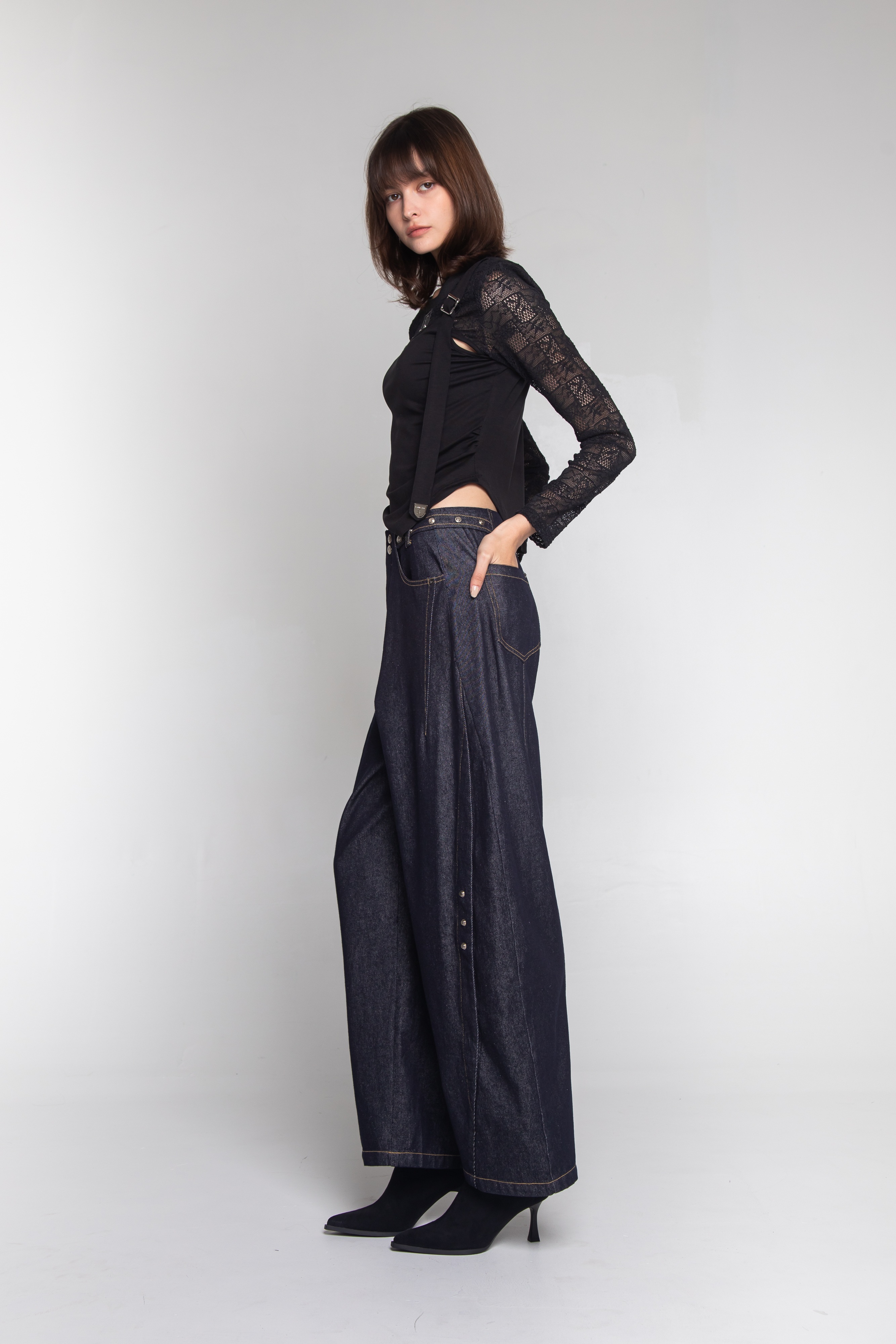 這款牛仔彎刀長褲以沉穩展現出低調而充滿結構張力的時尚氣質。褲型採用了獨特的花苞/彎刀式剪裁,褲管從腰部自然寬鬆,並在膝蓋處略微收攏後再次展開,營造出充滿設計感的立體廓形。