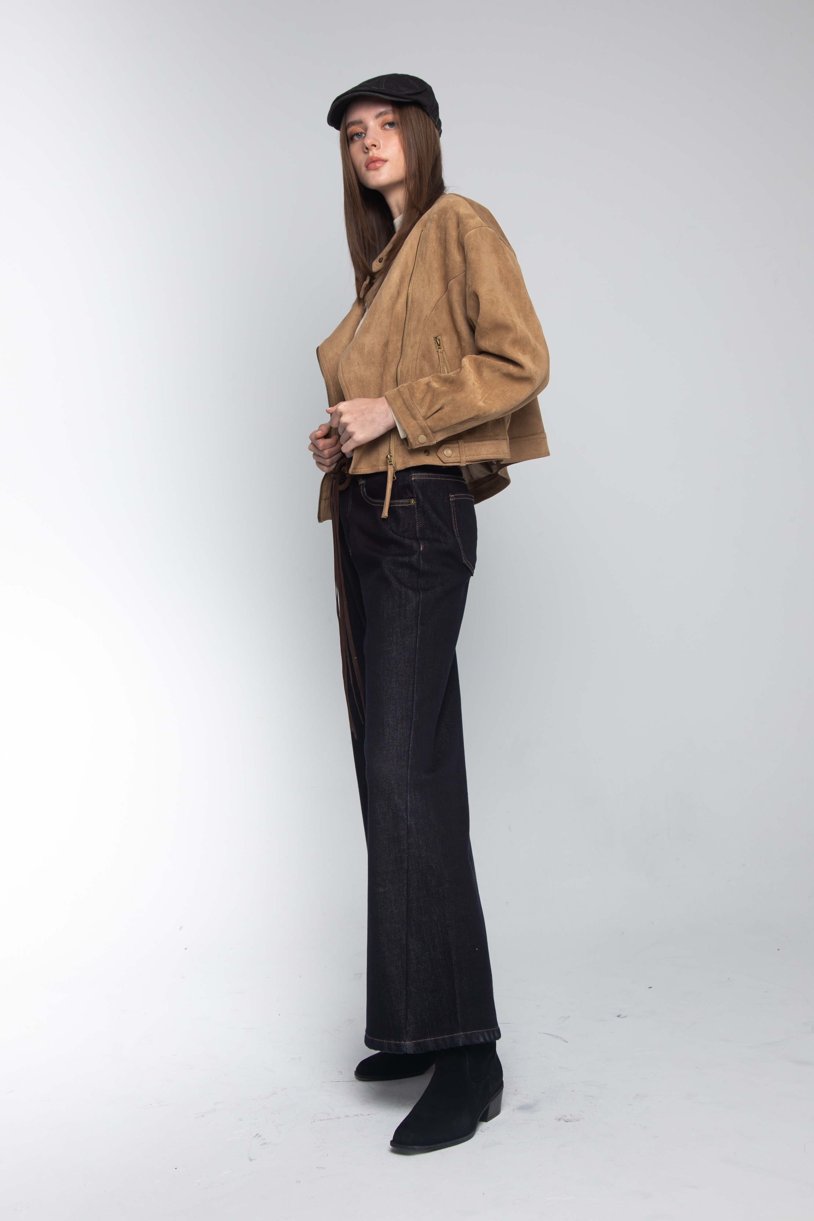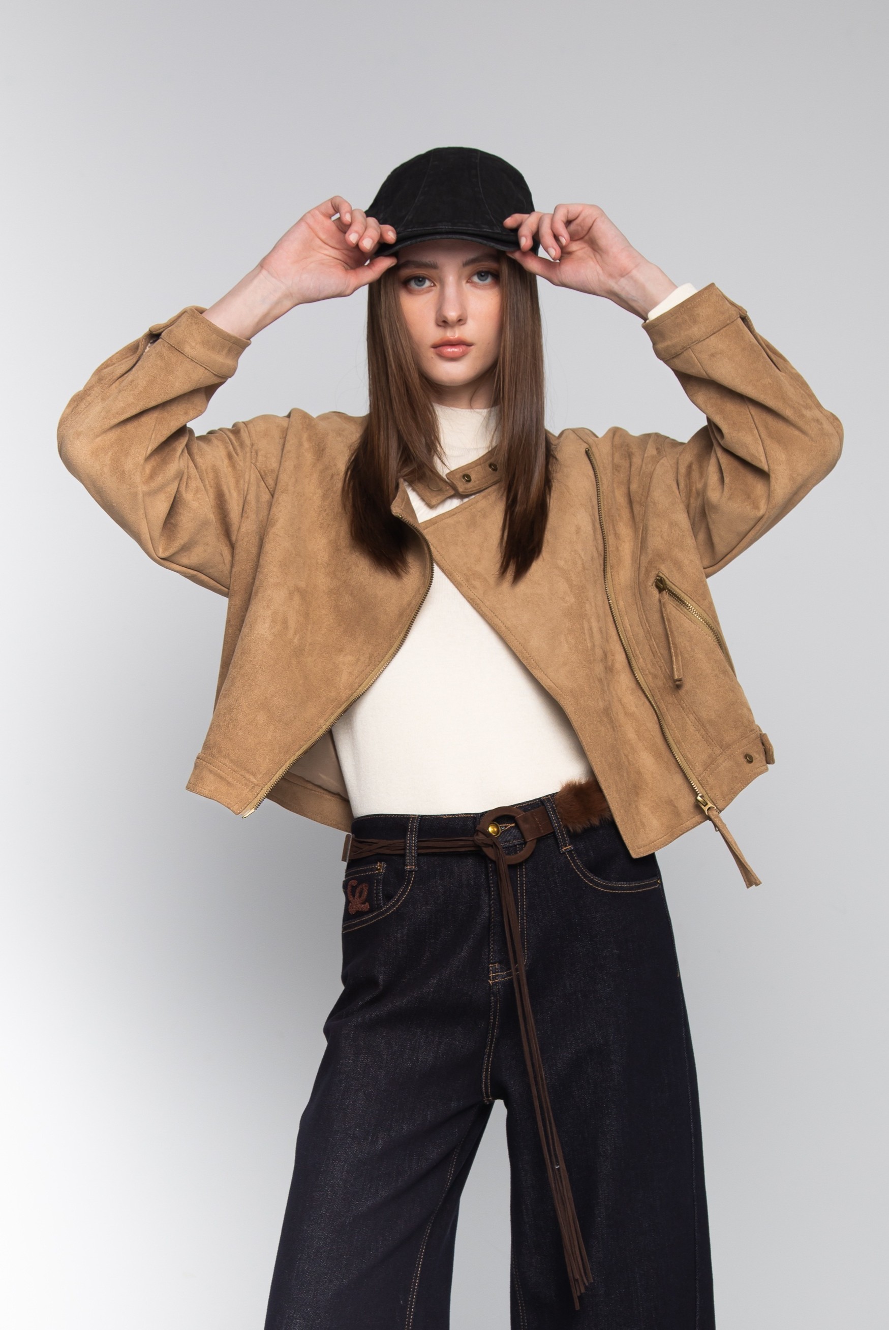 這款帥氣麂皮外套,採用極具質感的焦糖駝色,結合手感細膩且視覺高級的仿真麂皮面料,透過不對稱的設計細節,為冬日穿搭注入一份獨具魅力的瀟灑與挺拔。