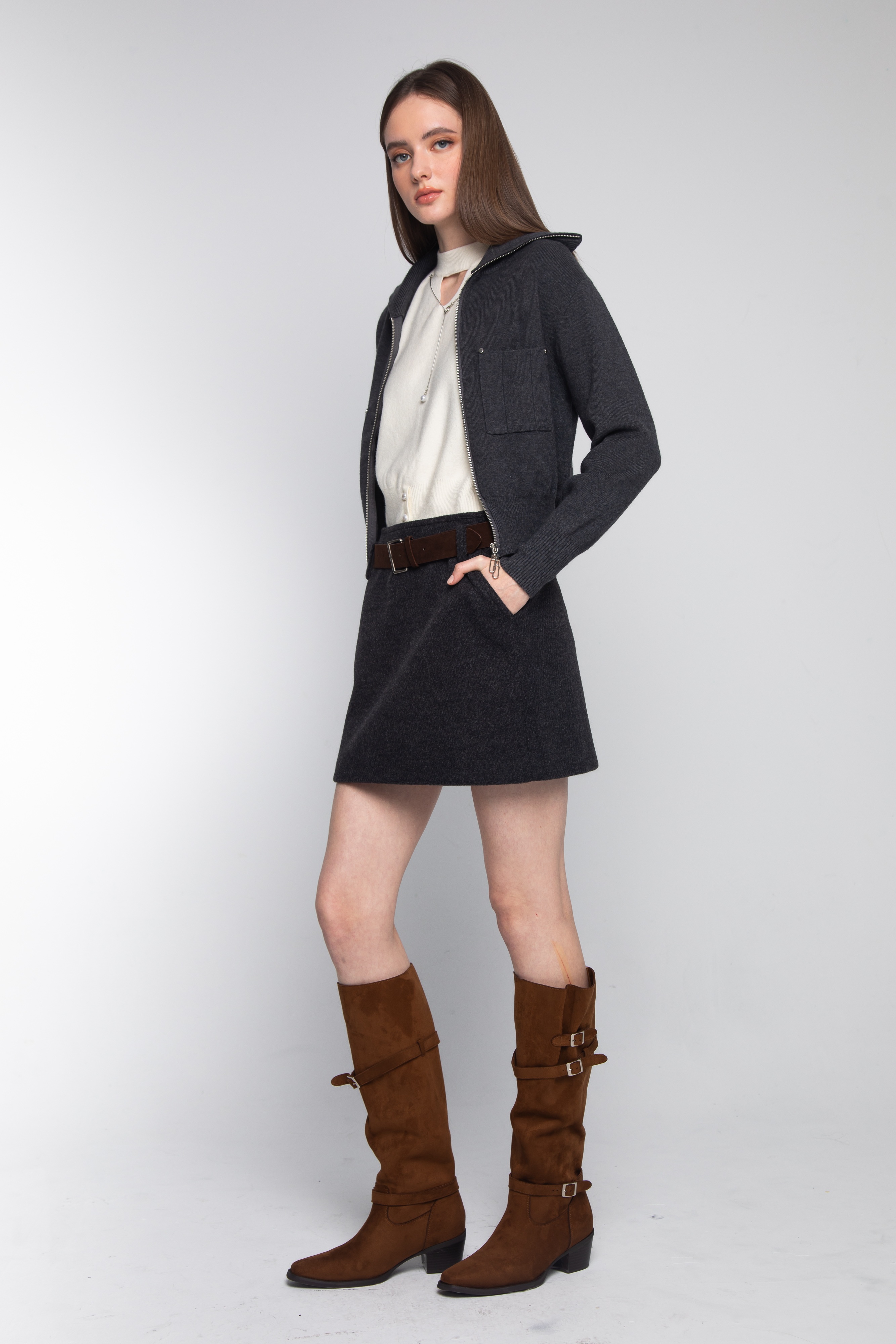 這款口袋拉鍊上衣以沈穩幹練的深灰色為主調,透過柔軟的針織材質結合硬朗的金屬拉鍊與機能感口袋,打造出一件兼具溫暖觸感與工裝帥氣感的質感單品。