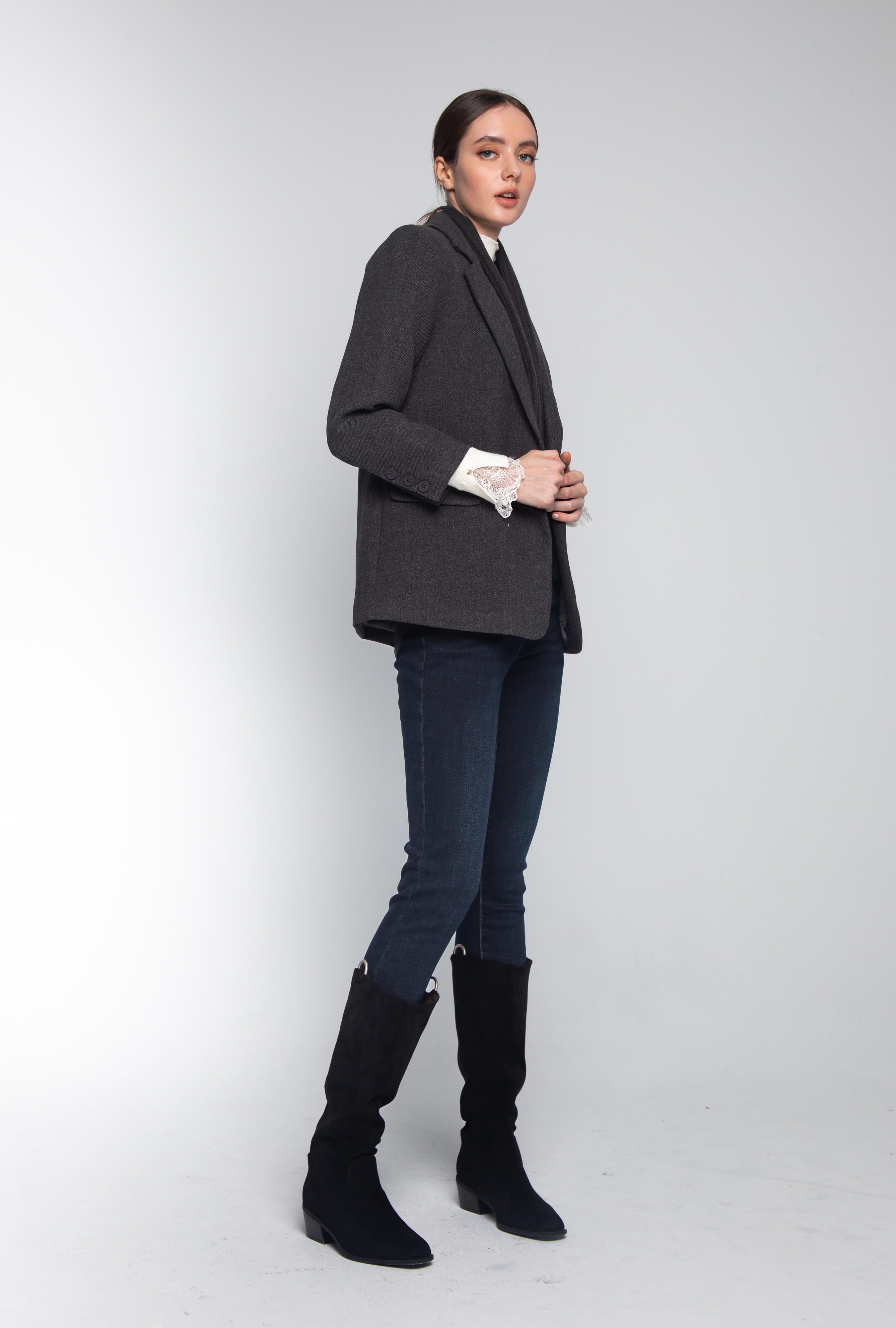 這款圍巾西裝外套,採用沈穩知性的深炭灰色毛呢面料,將「同色系針織圍巾」與「經典西裝廓形」完美揉合,在忙碌的通勤路途中,無需額外搭配,即可展現俐落且具備高級感的時尚底蘊。