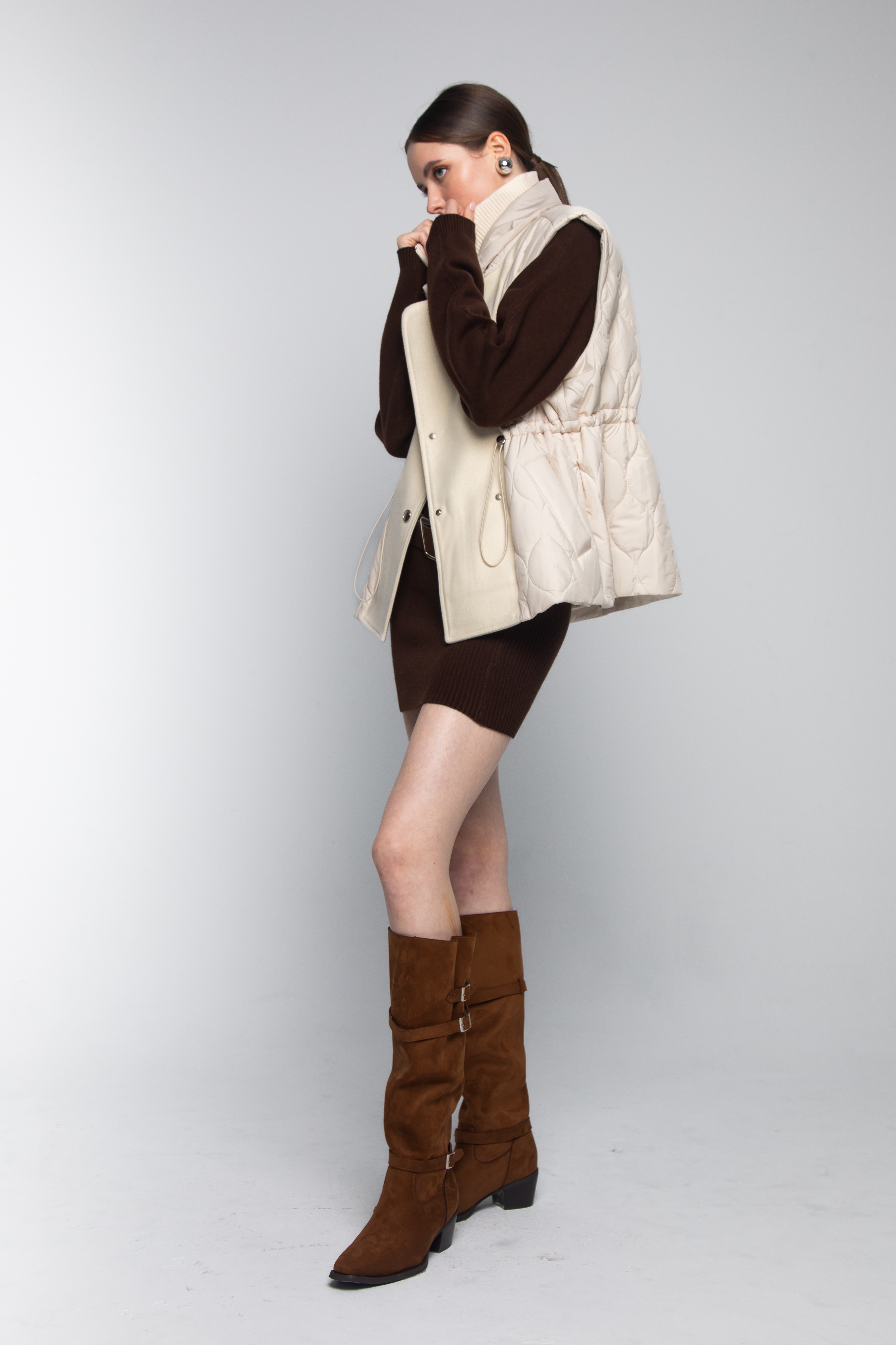 這款時尚鋪棉背心採用純淨優雅的米白色為主調,打破了傳統鋪棉單品的厚重感。透過精緻的波浪壓紋與柔軟的毛呢感面料拼接,在視覺與觸覺上營造出豐富的層次,是寒冷季節裡兼具保暖機能與優雅氣場的必備外搭。