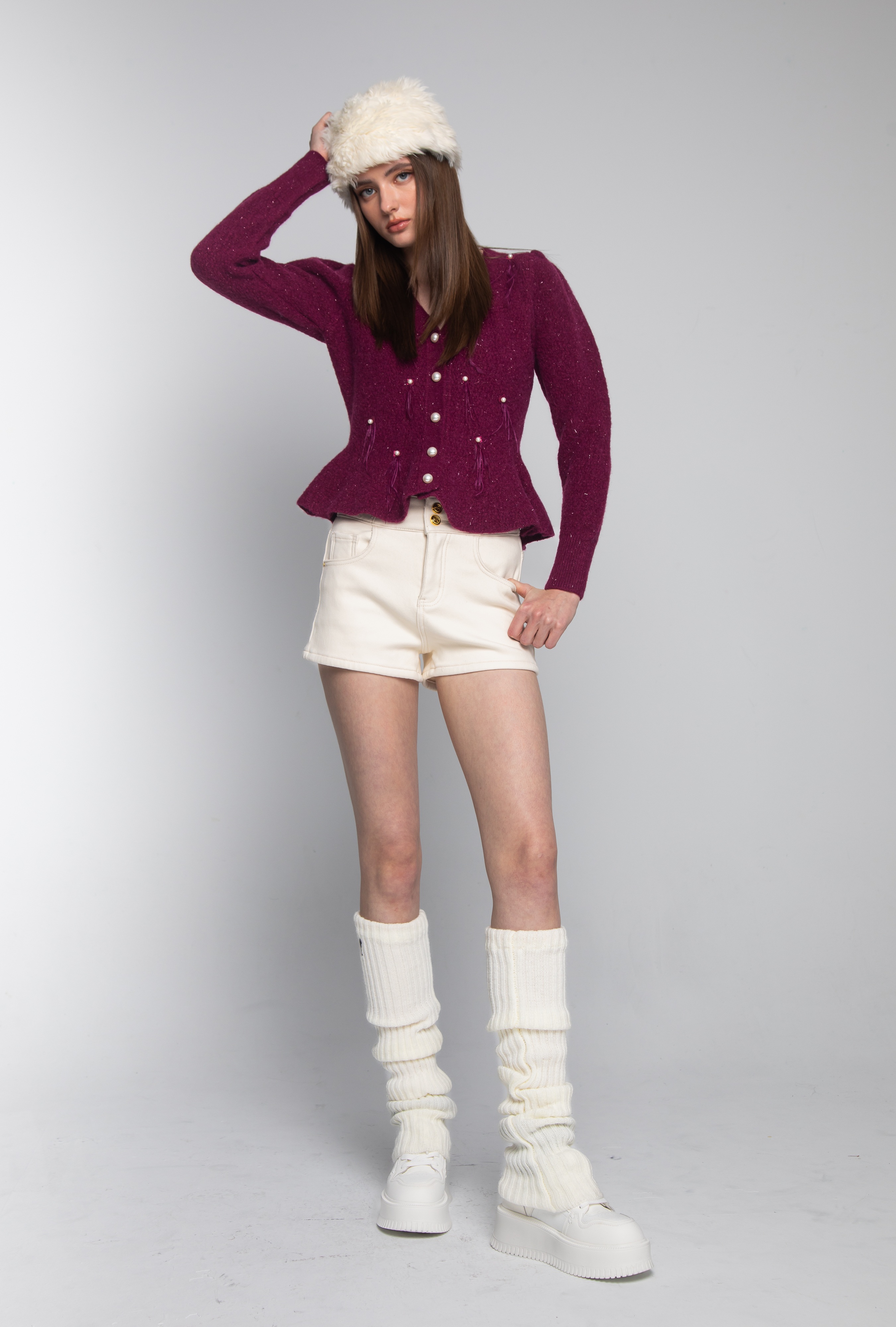 這款羽毛針織上衣採用濃郁典雅的莓果紫色,在細膩的織紋中揉合了細碎的銀色亮片,宛如冬日夜空中的繁星。