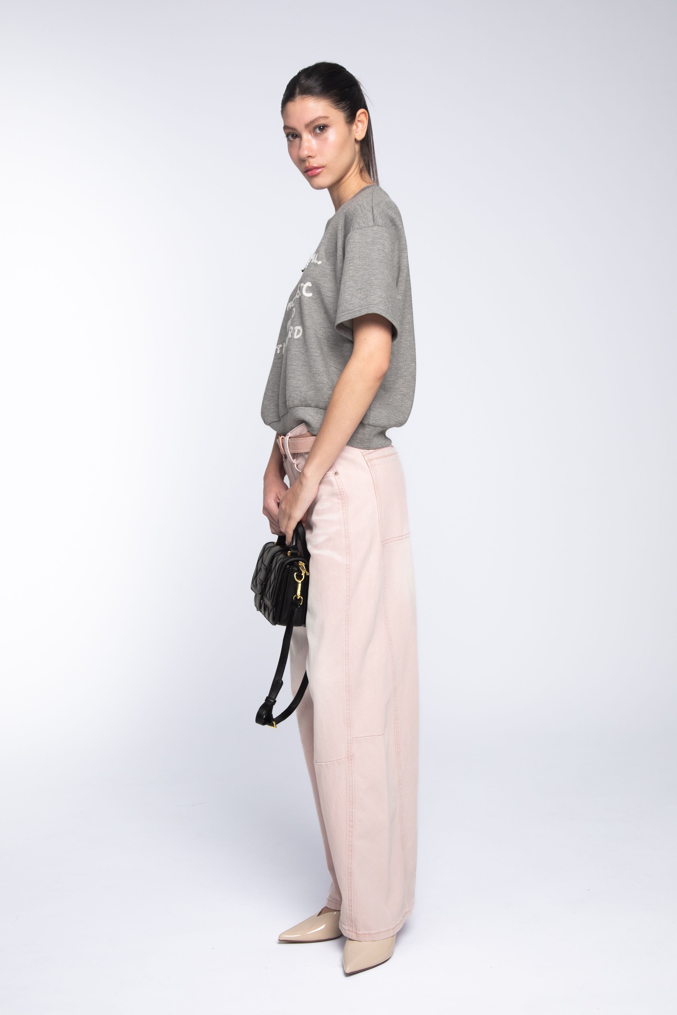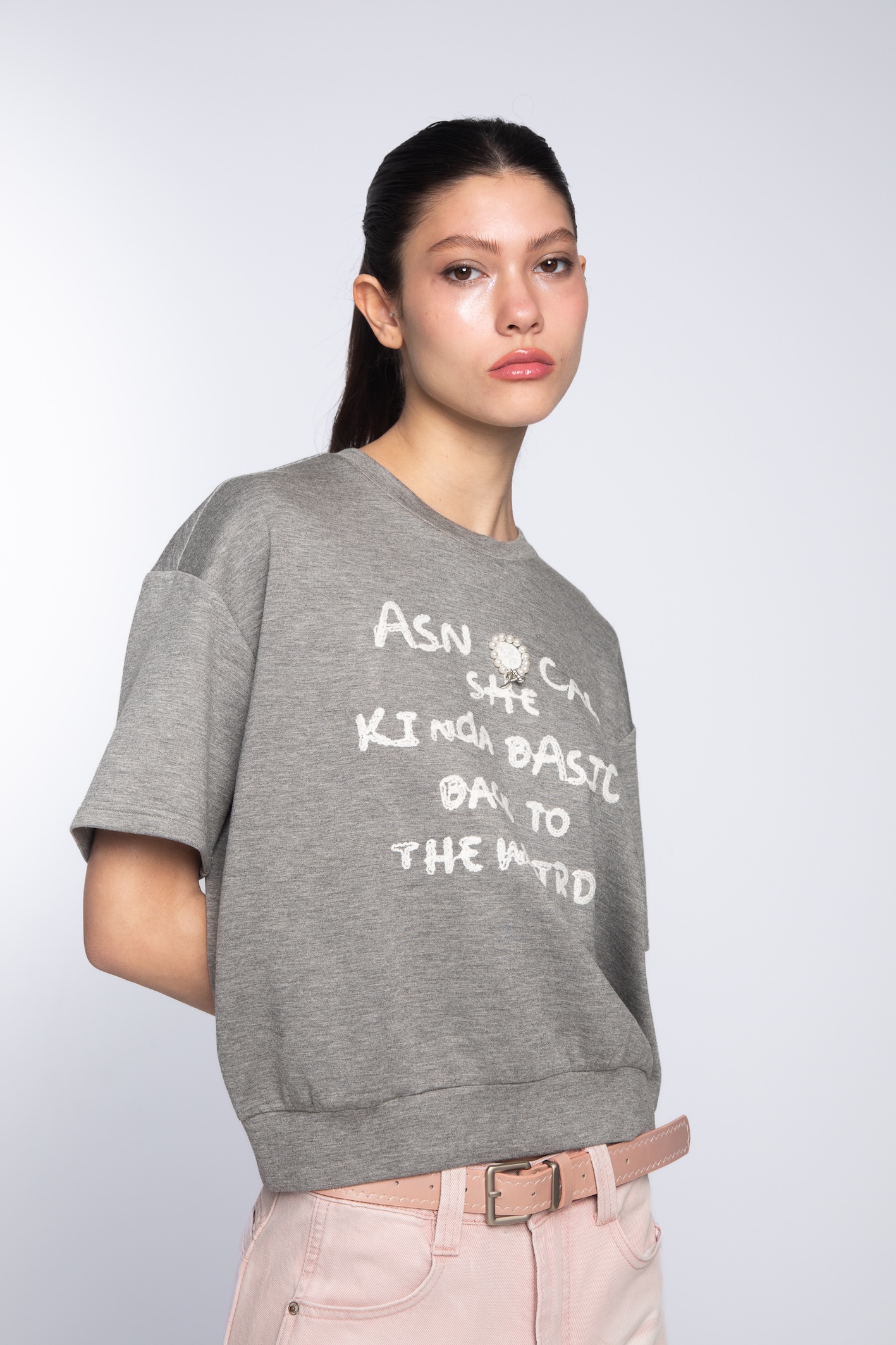 這款俏麗短版上衣,以百搭且帶有溫柔休閒感的麻灰色為基調,打破了傳統短袖衛衣的單一性。透過個性化的標語與閃耀的裝飾,在輕鬆自在的穿著體驗中,依然能展現出不容忽視的時髦態度。