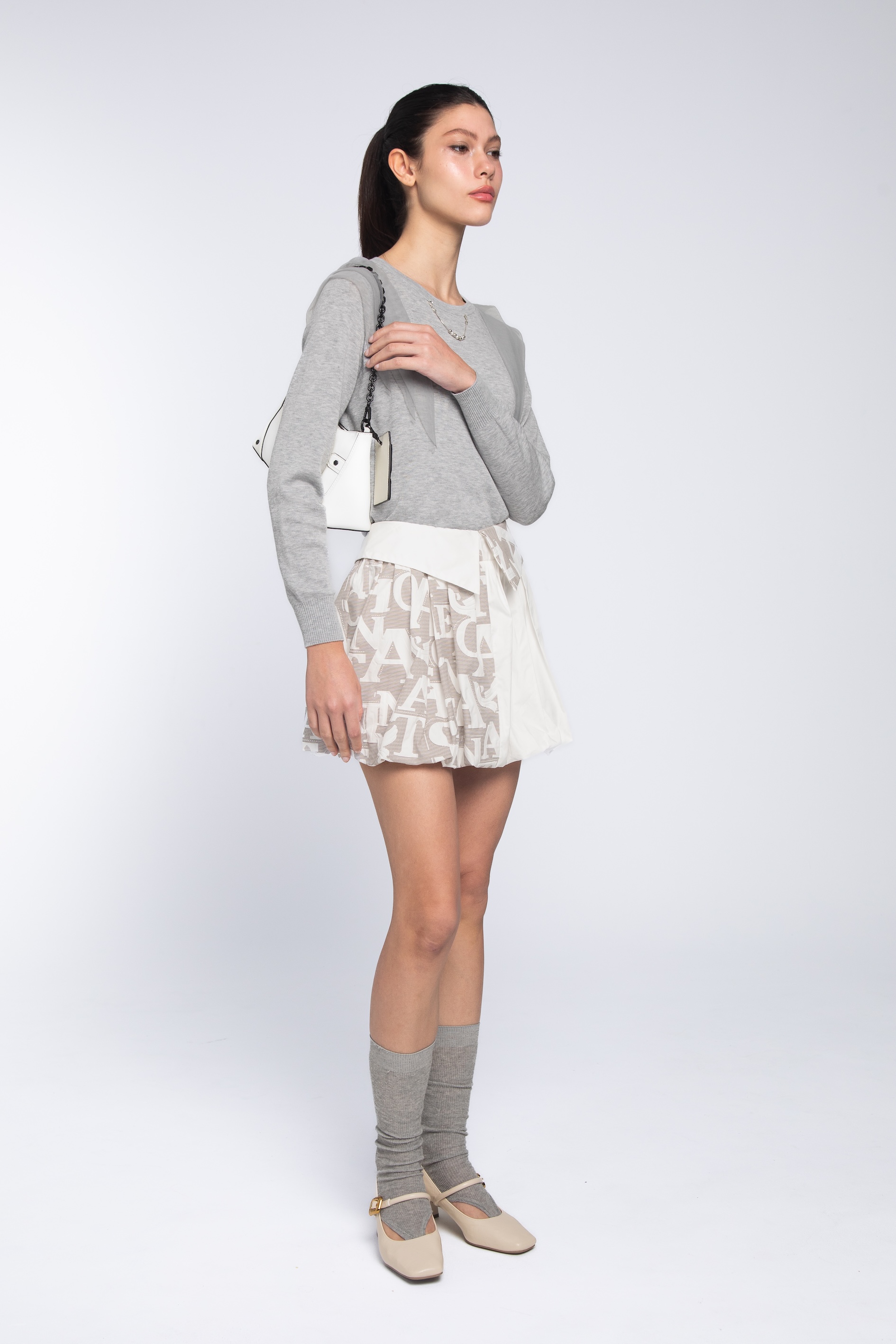 這款拼接造型短裙,巧妙地將純淨的亮白色與充滿都會氣息的燕麥色字母印花結合,打破了常規裙裝的對稱框架。它不僅是一件下身單品,更像是穿在身上的現代立體藝術,讓您在街頭漫步時自帶極高的時尚辨識度。