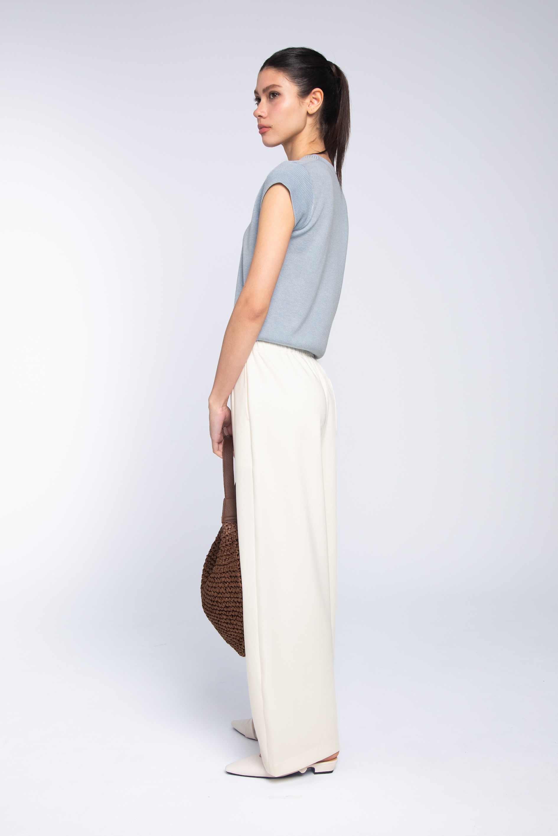 這款圓領針織上衣,以純淨且充滿知性氣質為基調。它捨棄了繁複的設計,透過細膩的針織肌理與流暢的剪裁,為日常穿搭注入了一份宛如微風拂過般的清爽與從容。