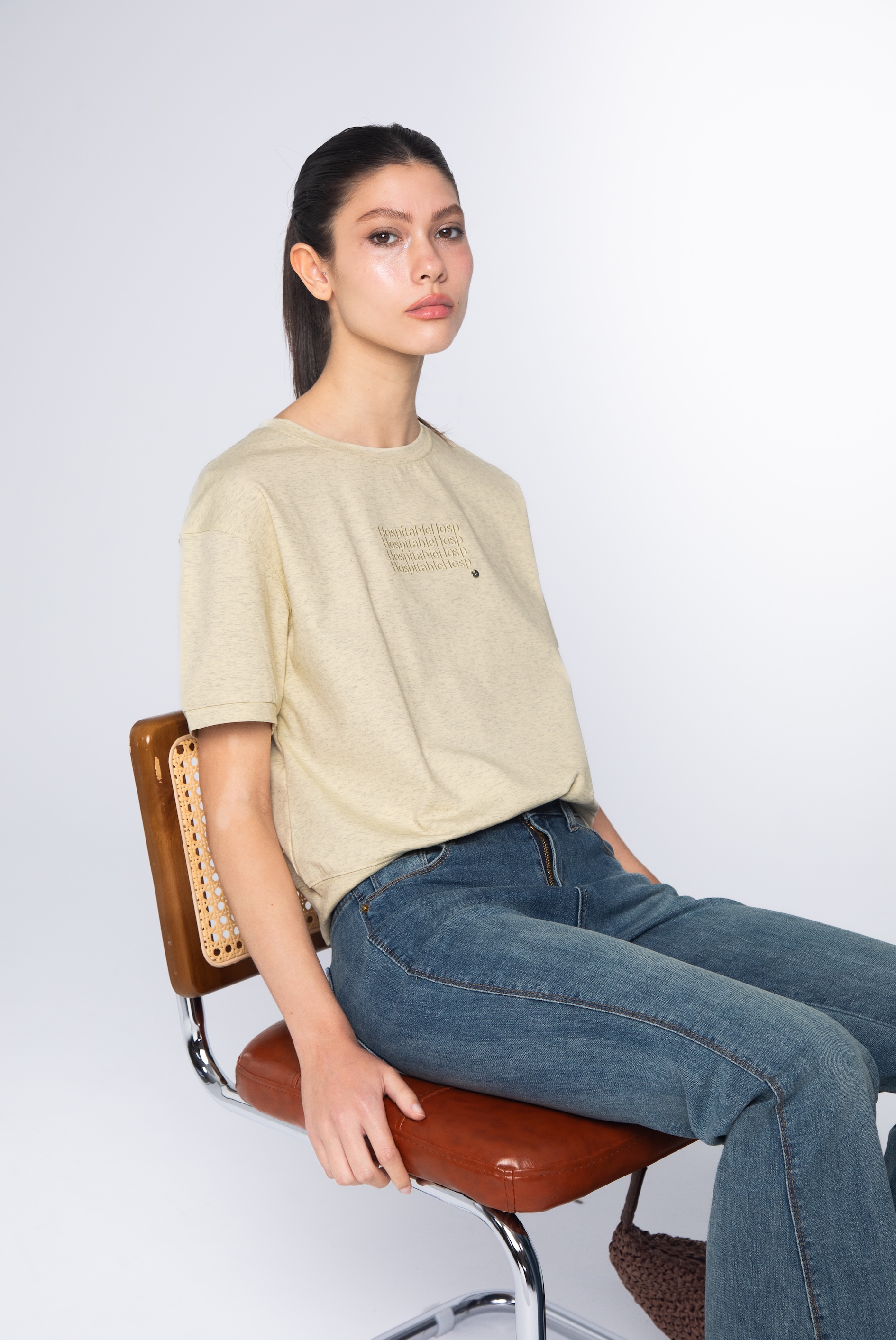 這款圓領文字上衣,以帶有自然有機氛圍的花紗燕麥綠色為基底。它捨棄了傳統 T 恤張揚的大面積印花,轉而透過同色系的立體文字與獨特的面料肌理,為日常穿搭注入一份內斂、從容且經得起近看端詳的靜奢氣質。