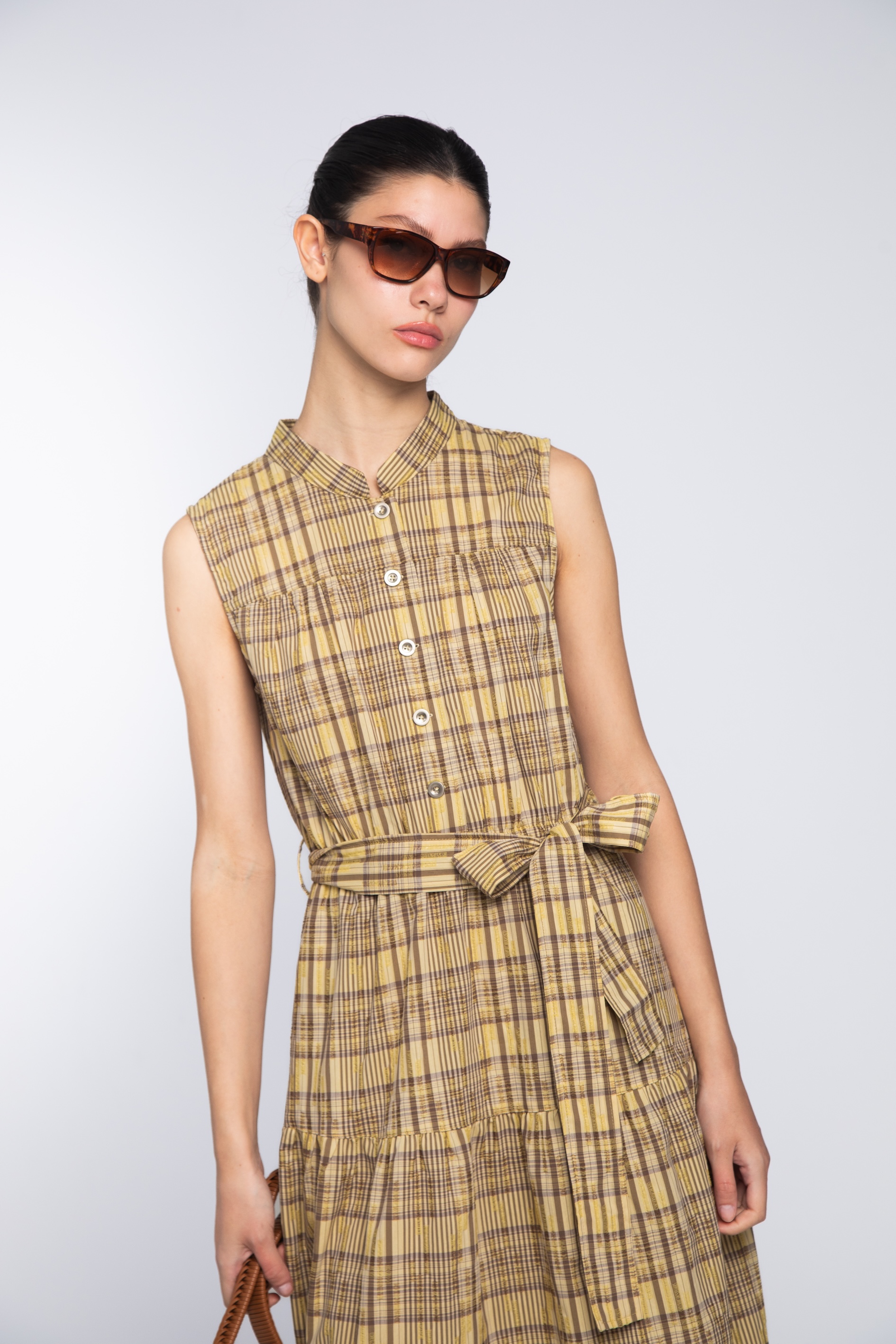 這款格紋連身長洋,以溫潤沉穩的芥末黃與大地棕色交織的格紋為基調。它捨棄了繁複的色彩,透過經典的幾何線條與充滿份量感的立體輪廓,在漫步都會街頭或度假旅行時都能散發出從容、知性且極具辨識度的高級文藝氣息。